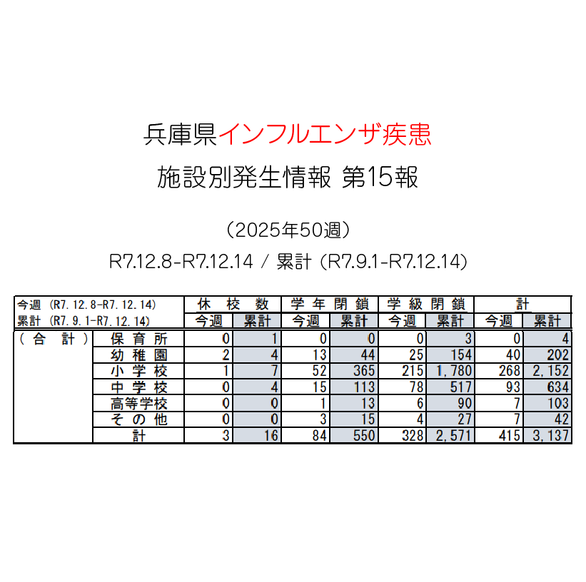 学級閉鎖の情報はインフルエンザのみ以下に掲載されています web.pref.hyogo.lg.jp/iphs01/kansens… 自治体別の詳細は以下のリンク先で速報が確認いただけます web.pref.hyogo.lg.jp/iphs01/kansens… その他の感染症は以下になります gakkohoken.jp/system_informa… #兵庫県 #インフルエンザ #学級閉鎖 #学年閉鎖 #休校 #休園 pic.x.com/wqcg88XQq6