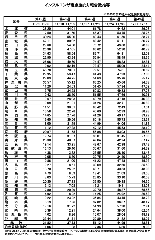 ④インフルエンザ2025年第49週(12月1日~12月7日) 出展:mhlw.go.jp/content/001609… 全国報告数 148,314 -25,066 定点当たり38.51 -6.48 全国休校数116 -154 昨年同期定点9.03 +4.17 昨年全国休校数24 +17 #厚生労働省 #インフルエンザ #休校 #学級閉鎖 pic.x.com/1Jm49h7rLG