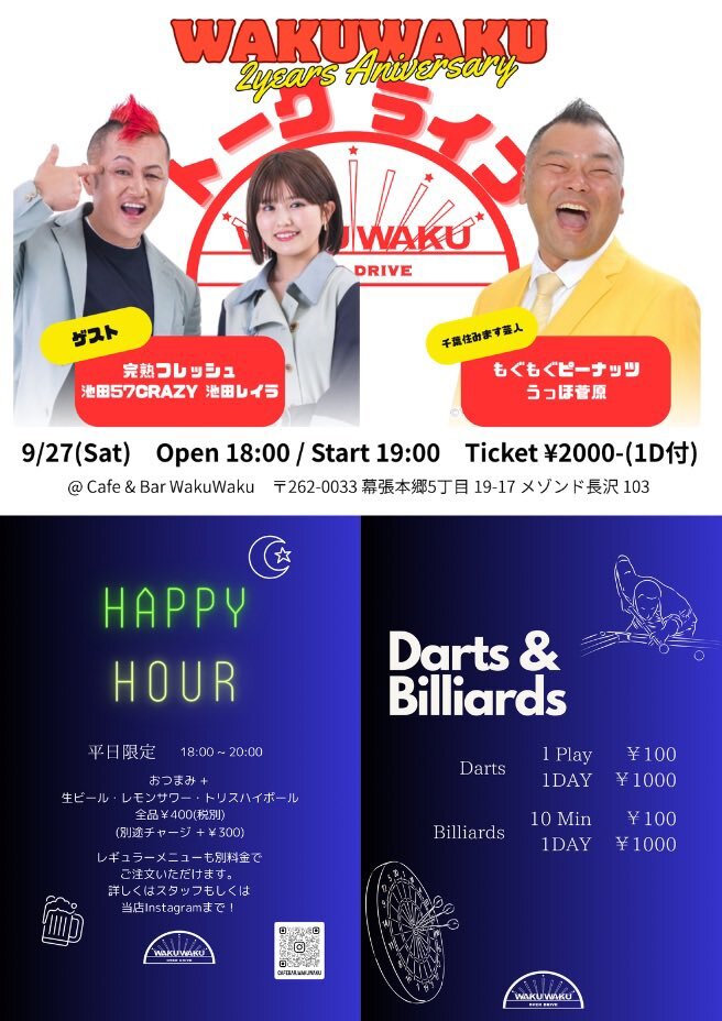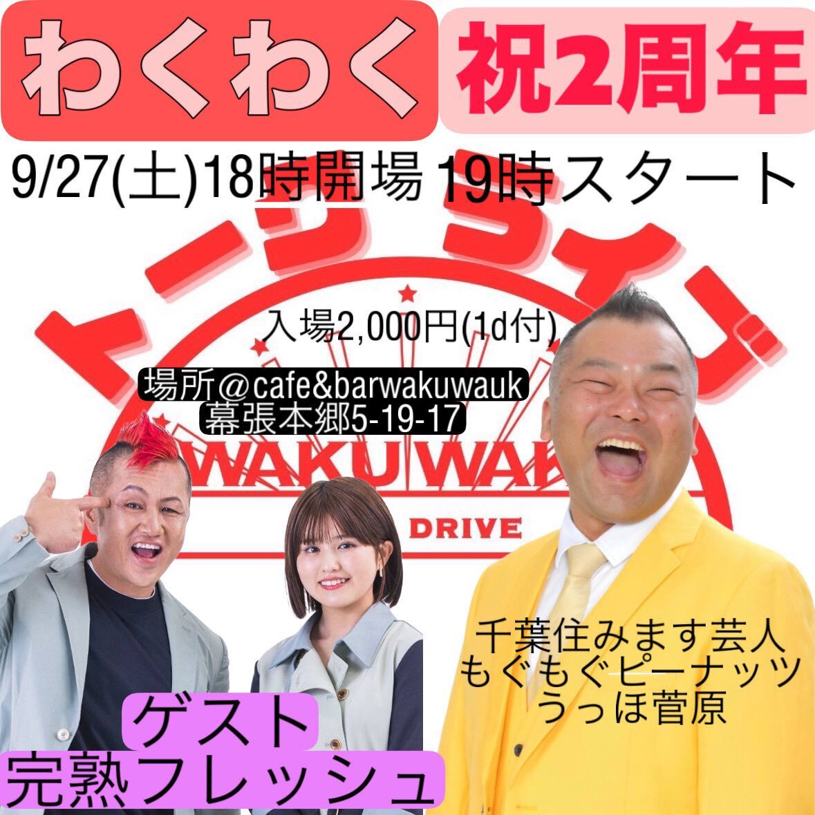 9/27(土)開場18:00開演19:00〜80分 『わくわくトークライブ2周年SP』 幕張本郷cafe&barWAKUWAKU 花見川区幕張本郷5-19-17 料金2,000円1ドリンク付き #もぐもぐピーナッツうっほ菅原 #完熟フレッシュ #池田57CRAGY #池田レイラ #cafebarWAKUWAKU pic.x.com/KTGfgLrlFX