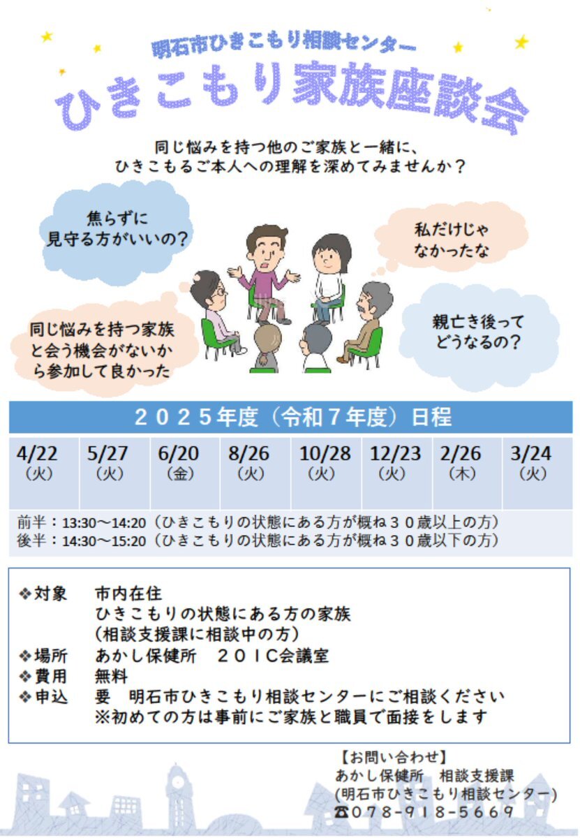12/23は家族教室です。当センターでは、ひきこもりに悩むご家族を対象に族同士がつながり、思いを語る・聴く座談会があります。当センターに継続されているご家族の方が対象です。参加希望の方は、電話・WEBから申し込みを。 #ひきこもり #明石市 #家族教室 pic.x.com/7O3C5dWV70