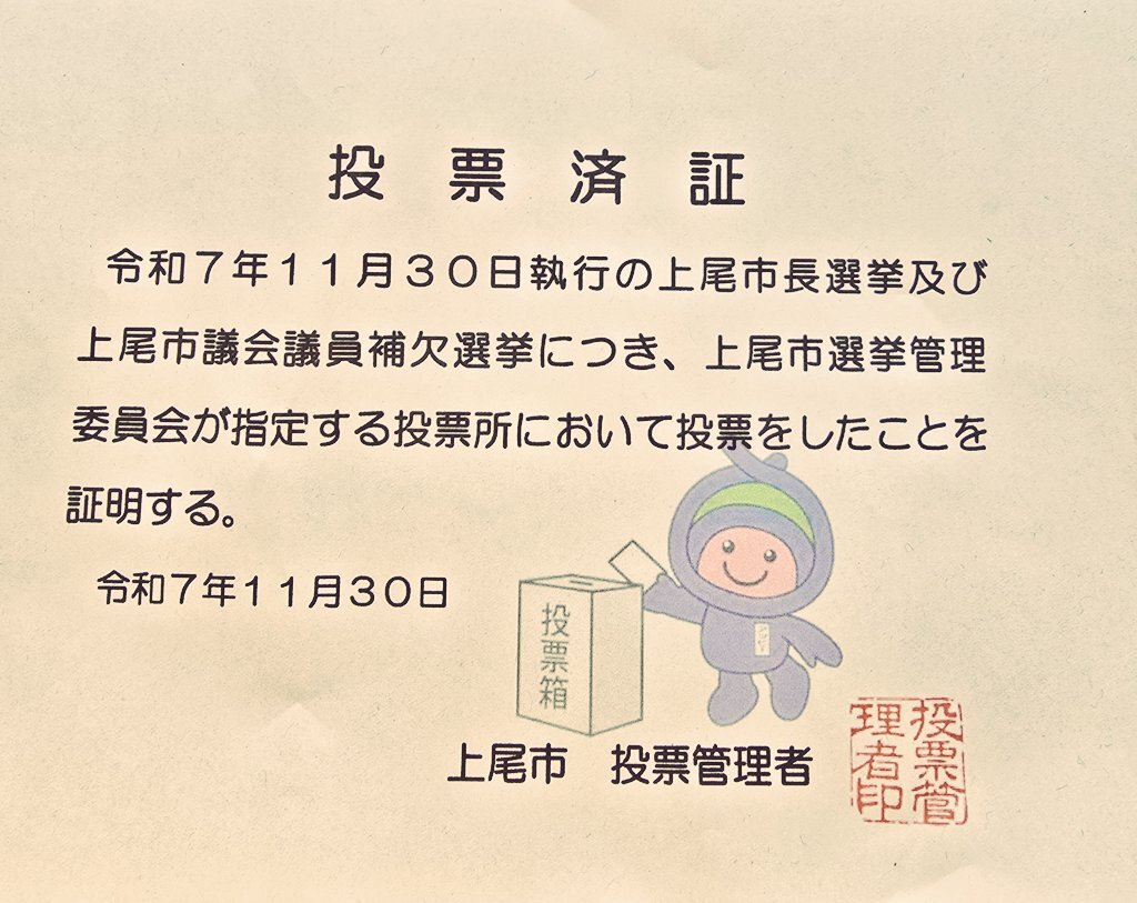 (*´∀`*)y-゚゚仕事の帰りに 上尾市長選挙 並びに 上尾市議会議員補欠選挙...に投票しました 三つ巴な 市長選 結果楽しみょね (笑) 投票済証...集めわ 意外と楽しい趣味で おすすめか...も(笑) #上尾市 #上尾市長選挙 #投票済証 pic.x.com/PUKKm8Olvq