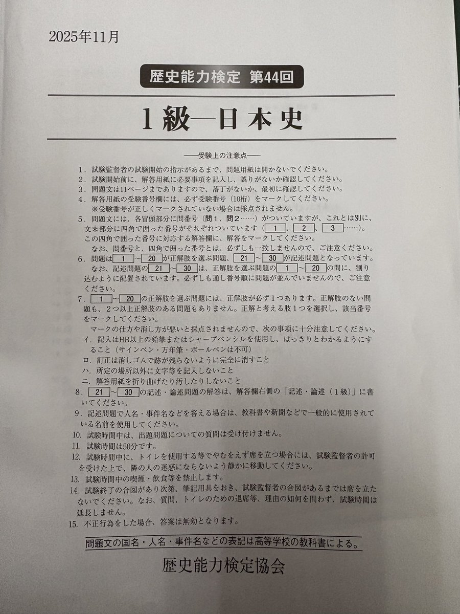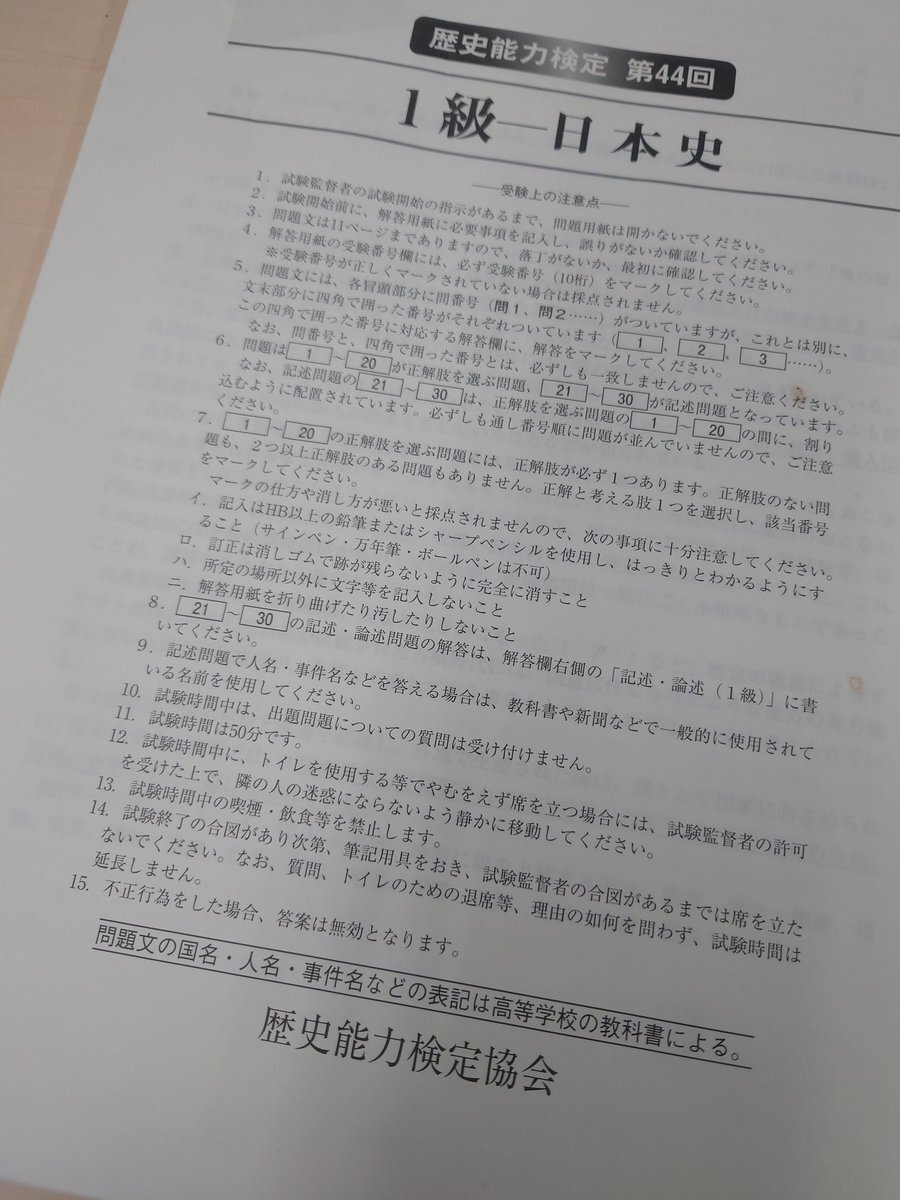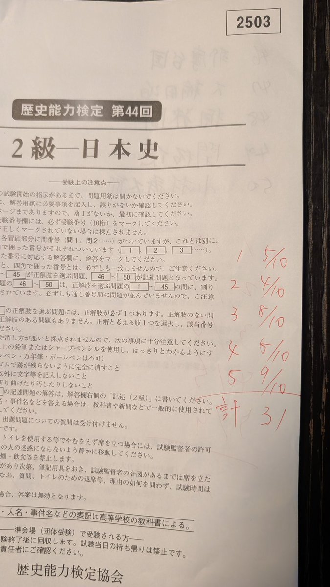 【第44回歴史能力検定(日本史)1級】 11/23(日)に受験し、自己採点しました。 結果は71/100と微妙な点数・・・ (論述は少なくても半分は点貰える計算) 中学生の時から欲しかった資格。 初めてでいきなり1級受けてみました。 記述は全問正解。思ったより4択間違えました。 #歴史能力検定 #歴検 pic.x.com/mIkHGYOZKt