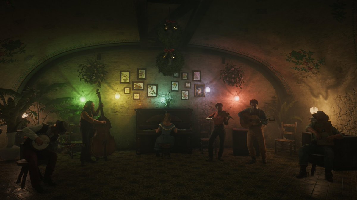 密造酒小屋のバーが クリスマス色に染まってた🎄 楽曲もジングルベル🔔 雰囲気出てきたね〜♬ #RedDeadRedemption2 #RedDeadOnline #RDR2 #RDO #RDOnline #RDオンライン pic.x.com/A7O1MehEML