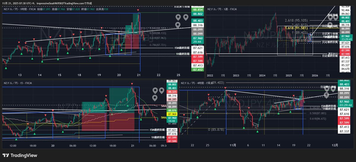 ■AUD/JPY ・週足高値に近付いている事を忘れない ・4H三尊になるかもしれないと待機していたが、安値更新できずWB形成 ・FR78.6を抜けきれなかった ・11/22 前回安値を更新できなかった ・4Hダウ転換ポイントが下に迫っていた ・15M高値更新,安値切上げ 1本目 RR1:1 2本目 RR2:36 #W手法 #dd手法 pic.x.com/IC1ZE8dxRh