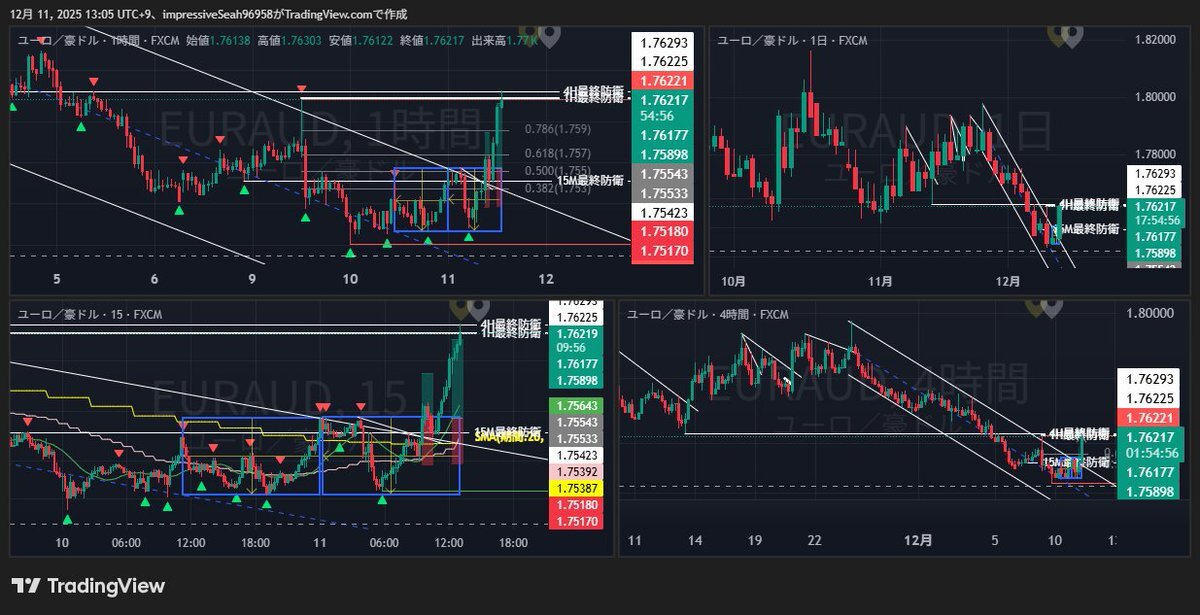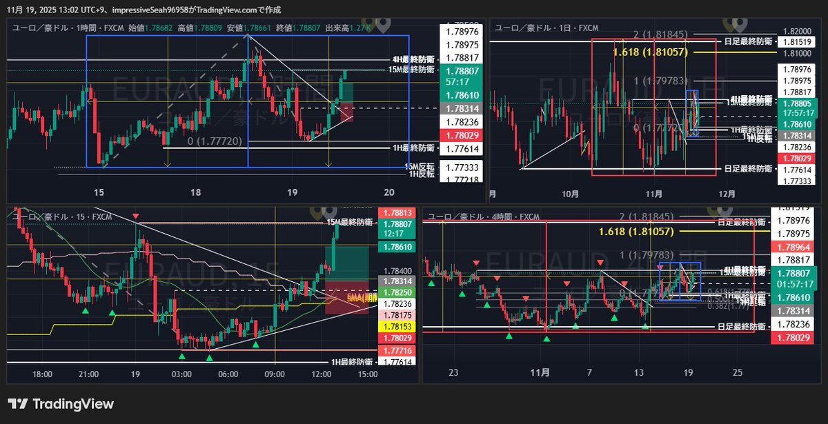 EUR/AUD 転換WB ・日足押し安値近辺まで押してきた ・1H高安値切上げ ・短期高安値切上げ ・下降チャネル抜け 1本目 1:1 2本目 FE1.618+1H転換ポイント #W手法 #dd手法 pic.x.com/rNwxCvVDZp
