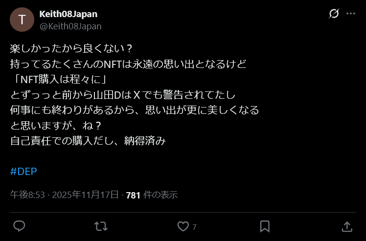 どうしても気になることが。 「N FT購入は程々に」という山田D(?)のXでの警告、私は見かけたことがないのですが、ご存知の方はいらっしゃいますか? それとも、この山田Dは山田CEOとは別の方なのか…。 #PlayMining #JobTribes #DEA #DEP pic.x.com/fNDngWtC9B