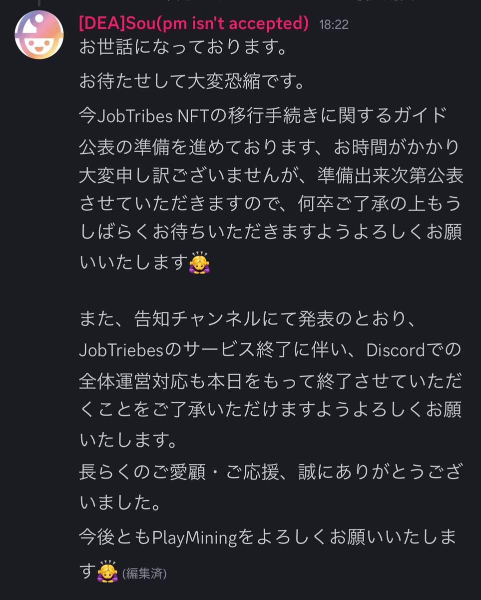#PlayMining の公式Discordは、ほぼすべてのチャンネルでユーザーの投稿が不可になりました。 #DEA 社は、こういう対応は早いようです。 それよりも #JobTribes のN FTの扱いに関するガイドを出してほしいです。 画像がどうなるか、などの質問に対しても「後日ガイドを公開します」との返答でしたし。