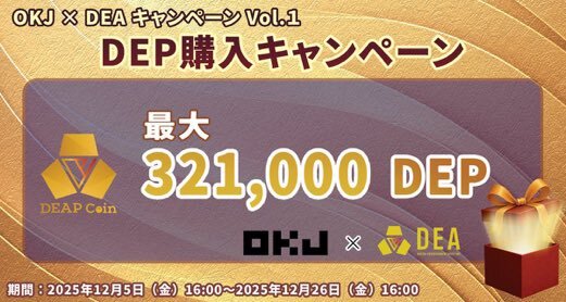 🎉 #DEA × #OKJ キャンペーンVol.1 本日から開催中! OKJで #DEAPcoin(#DEP)購入で最大321,000 DEPボーナスゲット!🎁 ぜひお見逃しなく!🔥 📅12/5(金)16:00~12/26(金)16:00 詳細はこちら👇 ✅PR TIMES: prtimes.jp/main/html/rd/p… #PlayMining pic.x.com/uCoFzjtC6s