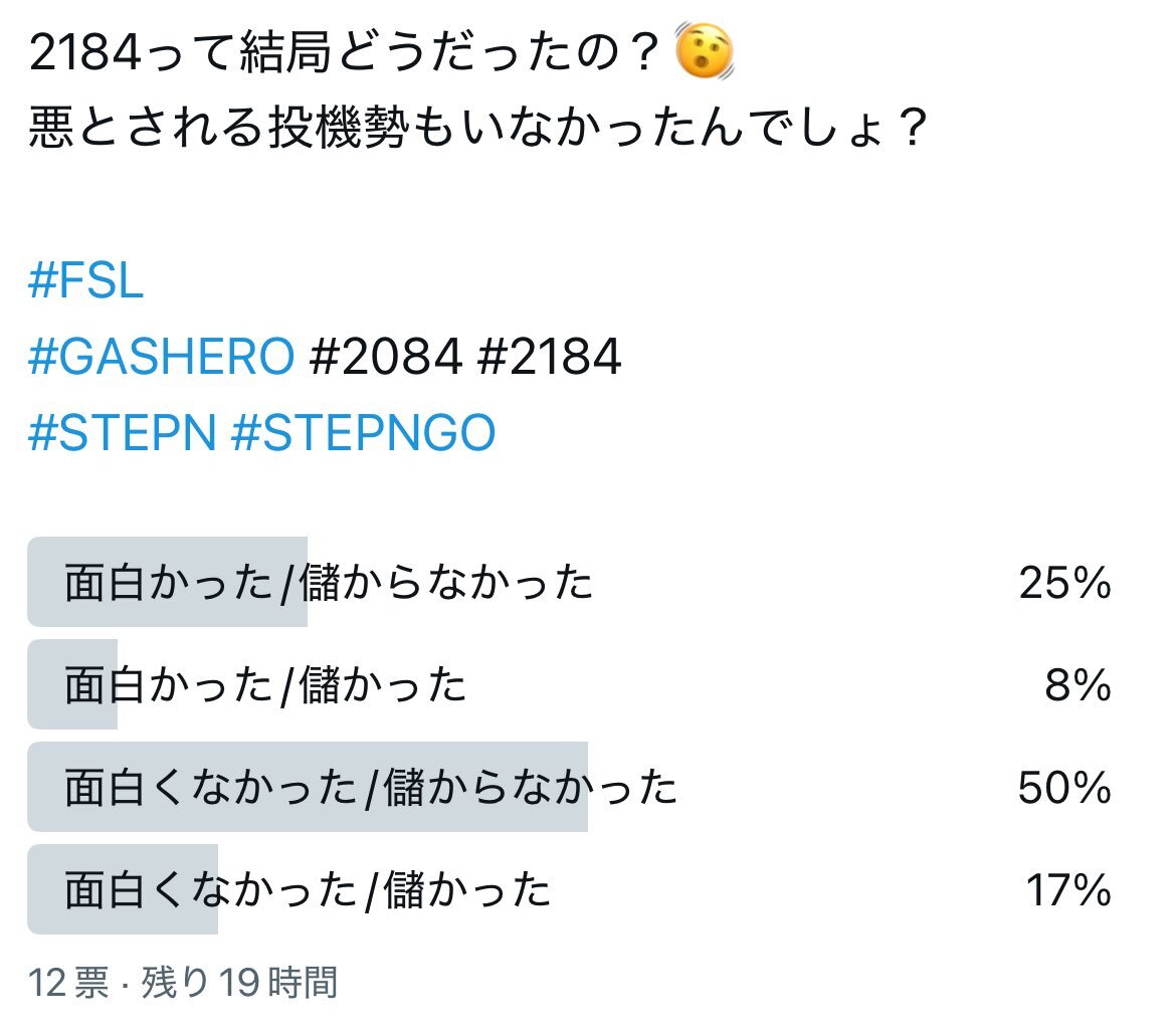 友達少ないうえ、人望もないので現在12票です😭wもっとN数増やしたいので宜しければ投票してくださいまし! #FSL #GASHERO #GASHERO2084 #GASHERO2184 #STEPN #STEPNGO 因みに現在↓↓ pic.x.com/wKvKAu4Eoa x.com/rinkstepn1/sta…