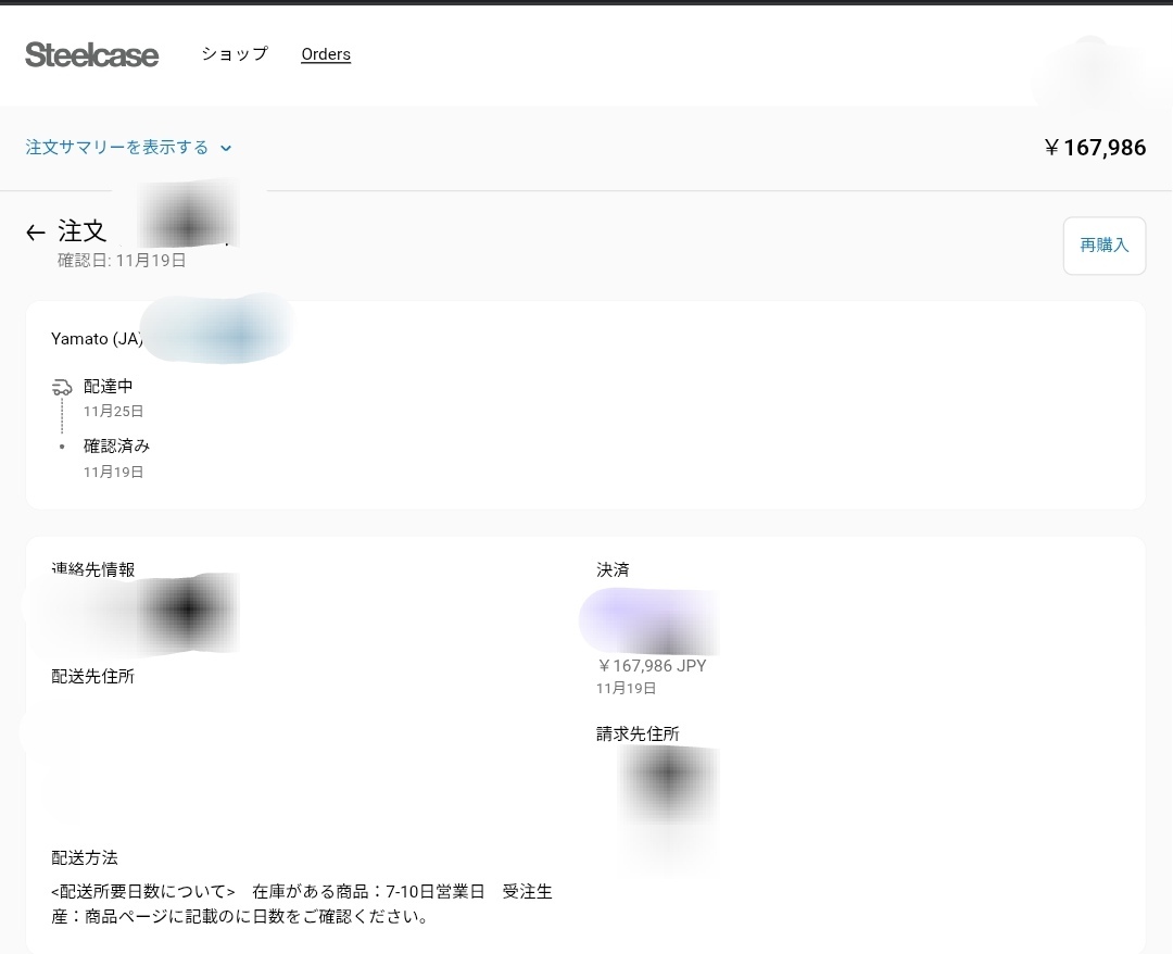#Steelcase #Gesture 30%引きで買ったけど11/19に注文してから届くのが12/1らしい アートセッティングデリバリーとか言うのが発送から配達まで7日かかるのがなぁ 千葉から関東ってそんなにかかるものなのか?と思ったが 在庫がある場合の配送が7-10営業日の時点で9日-14日目安だもんな 13日は範囲内か x.com/SteelcaseJP/st…