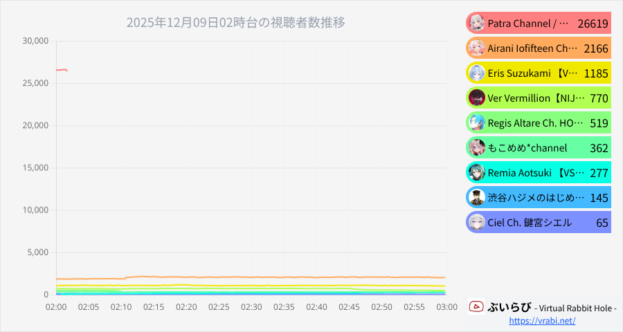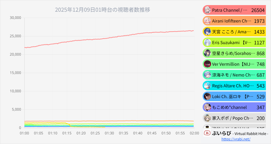 🏆​2025年12月09日02時台 【🥇26,619】Patra Channel / 周防パトラ #パトライブ 【ASMR】脳ゾクゾク!寝たまま聞くだけで気持ちいい!瞑想で… 【🥈2,166】Airani Iofifteen Channel hololive-ID #ioLYFE 【 Drawing 】Drawing The New Des… 【🥉1,185】Eris Suzukami 【VSPO! EN】 【VALORANT】… pic.x.com/V4t5Pftw7e