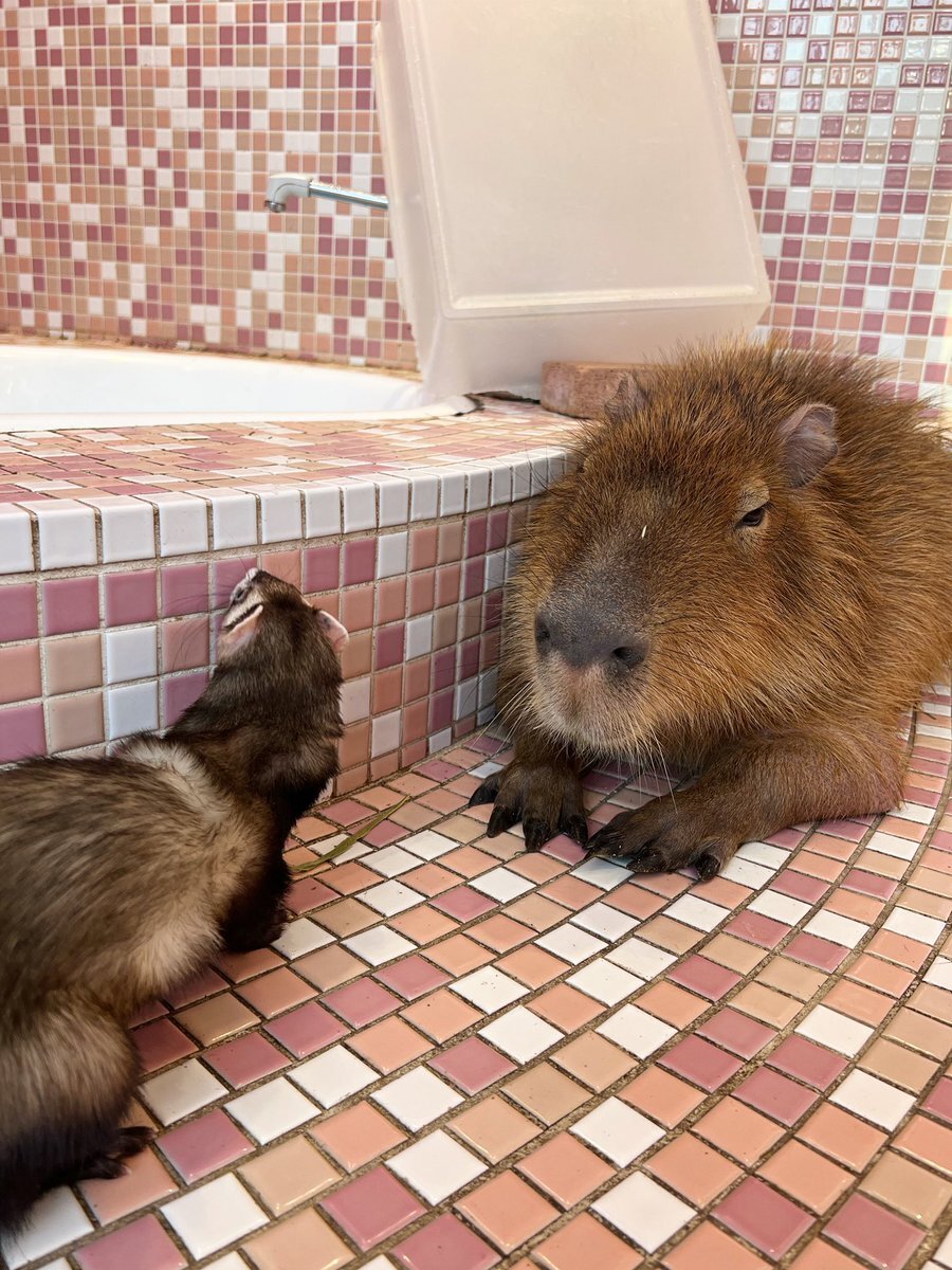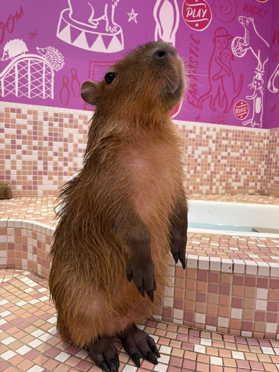 本日のトレーニングもぐちゃん🏋️🏋️‍♀️ リラックスモードからの直立🧍‍♂️ ☎︎ 03-3404-2233 #原宿かわいい動物園 #harajukuzooland #原宿 #harajuku #zooland #かわいい #kawaii #カピバラ #capybara #もぐ #mogu #芸ができるカピバラ pic.x.com/n1r8WabL21
