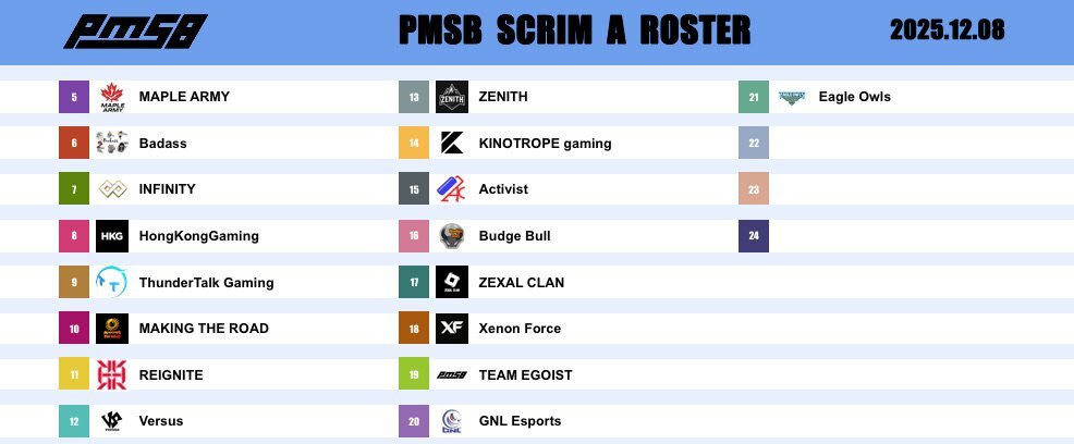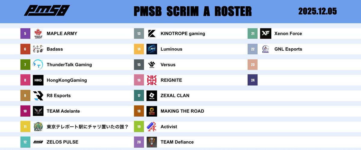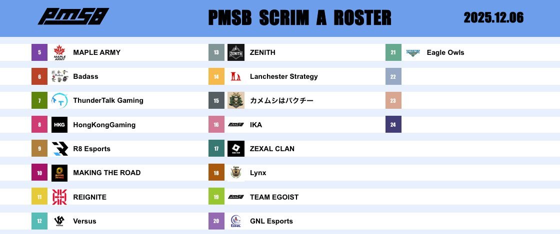 📅 2025.12.1 🔥 PMSB SCRIM|TODAY’S ROSTER 🔫 ━━━━━━━━━━━━━━━━━━ 🎙️ CASTER / 実況 ➡️ Seagull(@Seagull0302) 📺 STREAM / 配信チャンネル ➡️ youtube.com/@_pmsb_?si=vLn… ━━━━━━━━━━━━━━━━━━ #PMSB #PMOT #PMJL