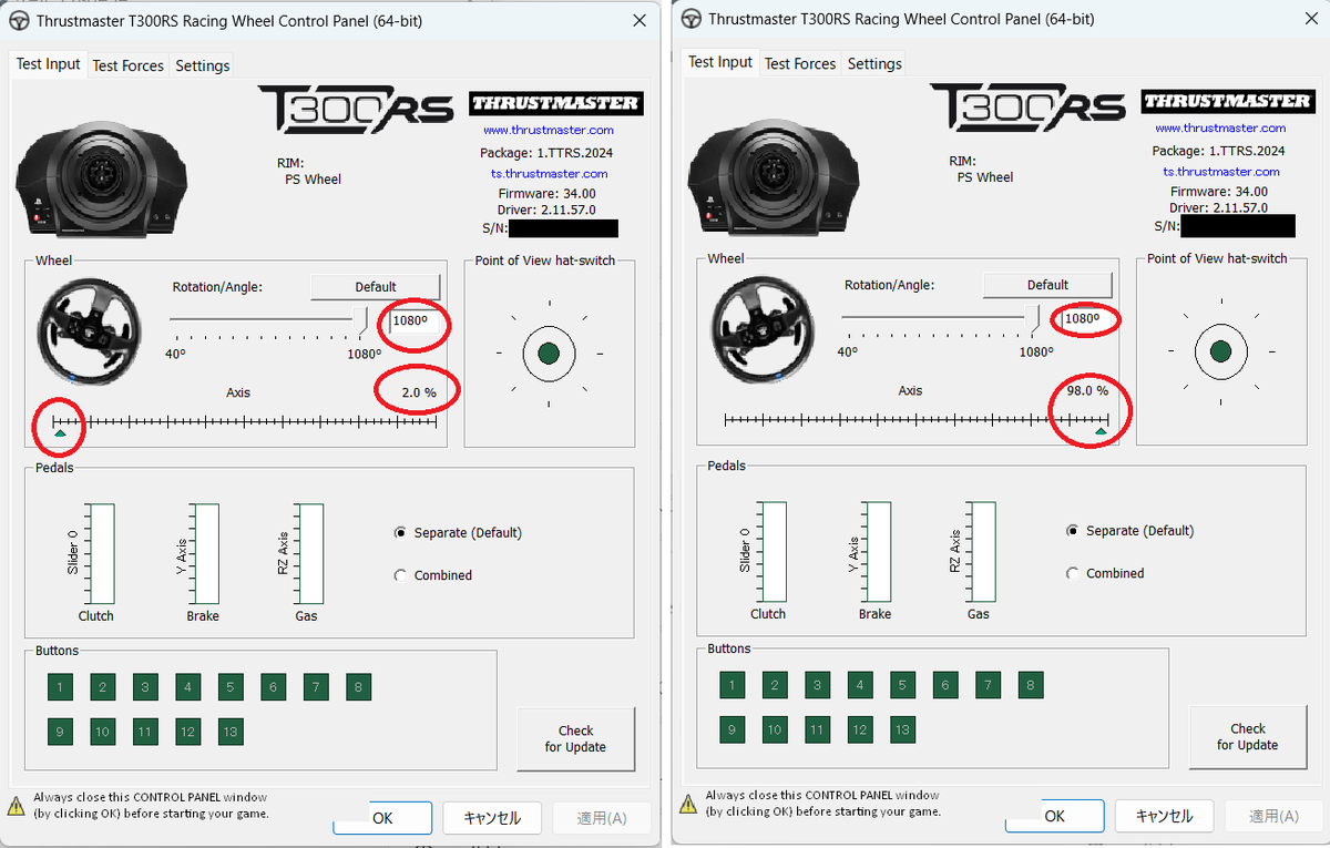 #Thrustmaster #T300RS #T300RSGTEdition ドライバ入れてセットアップしているのですが、Rotation/Angleを1080に設定してハンドルを左右に限界まで回した時のAxisが2%、98%で止まってしまう現象に悩まされています。 これは初期不良でしょうか? 情報お持ちの方いませんでしょうか。 pic.x.com/TV6v47o4ZY