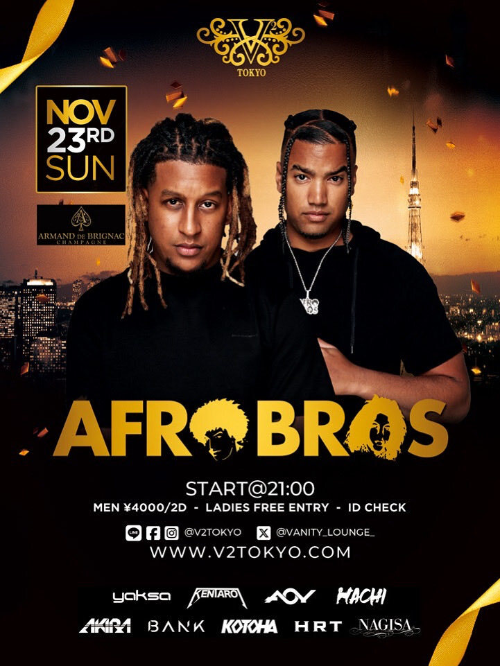 11/23 sun V2TOKYO @afrobros🔥🔥🔥 11/23祝前日、日曜日のV2TOKYOに オランダからAFROBROSの来日公演が決定🎉 @vanity_lounge_ #v2tokyo #afrobros #来日公演 pic.x.com/n99rlQ6NXa