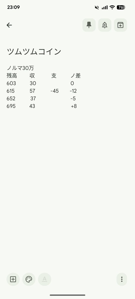 フック船長で大量消費したので三が日のためにメモを始めました ノ差というのは、ノルマとの差の記録開始日からの累計です これが+45になればスキチケピックアップガチャ引いてもノルマに影響が無いように振る舞えます #ツムツム #表計算アプリいいのあるかな pic.x.com/Vc0digpFsP