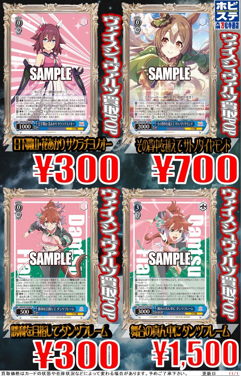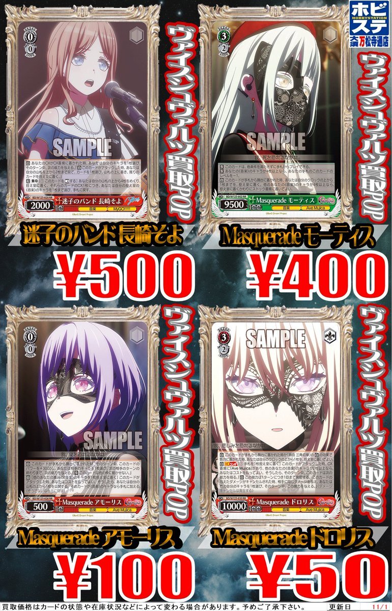 【#ヴァイスシュヴァルツ 買取情報】 迷子のバンド 長崎そよ ¥500 Masquerade モーティス ¥400 その背中を越えて サトノダイヤモンド ¥700 舞台の真ん中に ダンツフレーム ¥1,500 『BanG Dream!』 『ウマ娘 プリティーダービー』買取募集中! #WS #ws2tcg #バンドリ pic.x.com/OToZbwvuBF