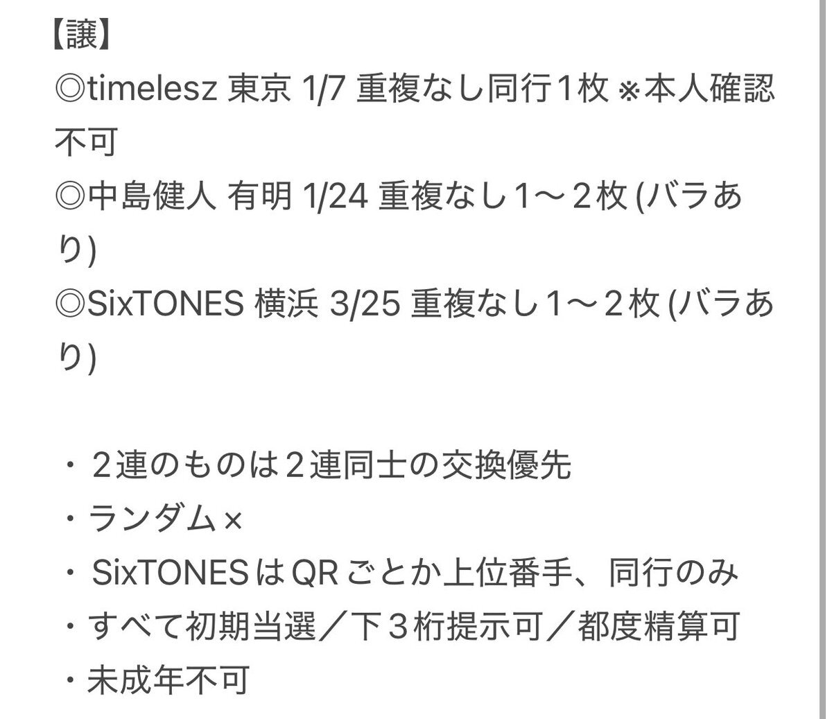 @1 イレギュラー交換を探しています。 【譲】 ・timelesz 東京1/7 ・中島健人 有明 1/24 ・SixTONES 横浜3/25 ※詳細は添付をご確認ください 【求】 Snow Man 東京 12/23,24,25,26のいずれか1〜2枚 お心当たりのある方はDMまでお願いいたします。 #timelesz譲 #中島健人譲 #SixTONES譲 pic.x.com/KZApP1bZ6j