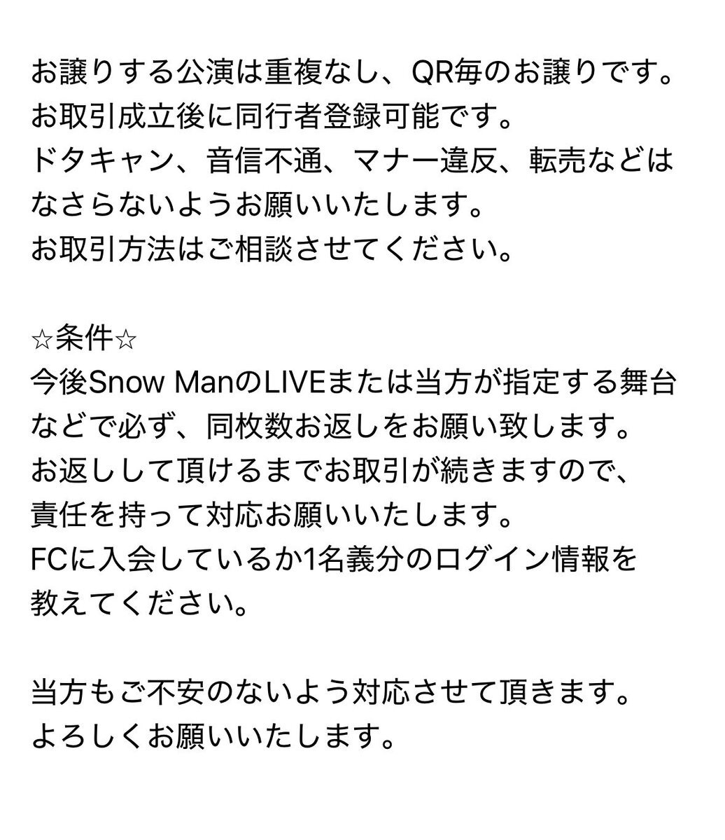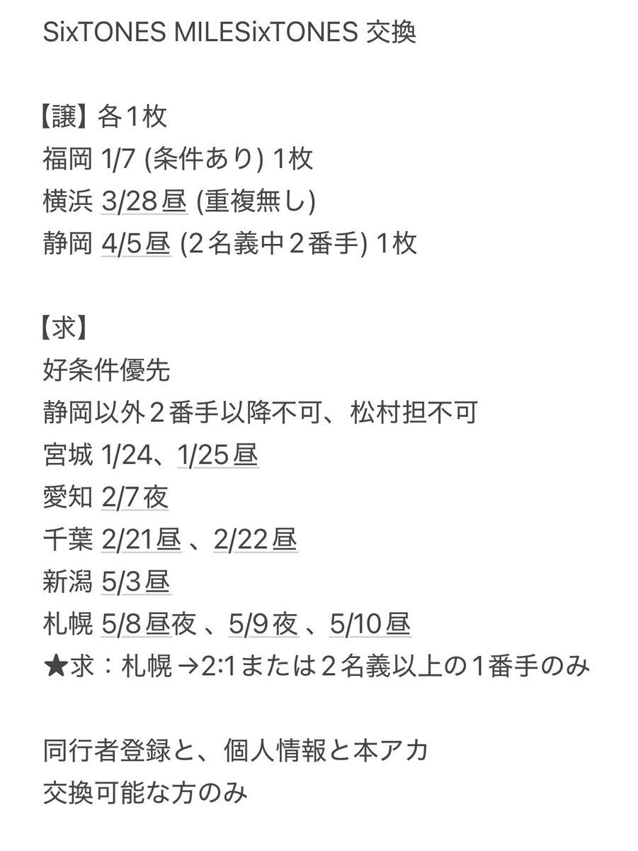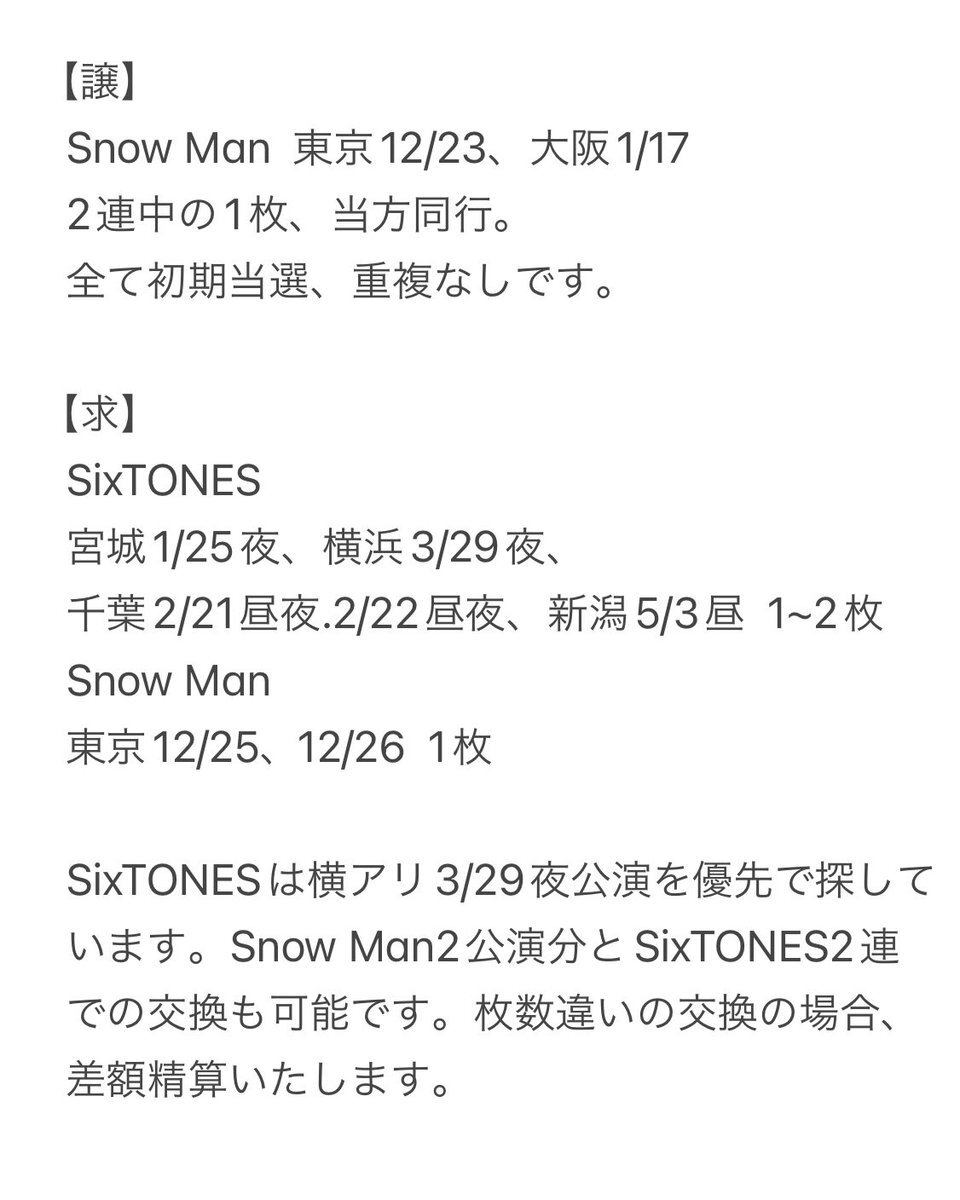 イレギュラー交換を探しています。 【譲】SixTONES 北海道 5/10 昼 2枚 【求】Snow Man 大阪 1/16、1/17、1/18 2枚 詳しくは画像を確認後、DMお願いいたします。 #SixTONES求 #SixTONES譲 #SnowMan求 #SnowMan譲 #イレギュラー交換 pic.x.com/YfKs7TxspW