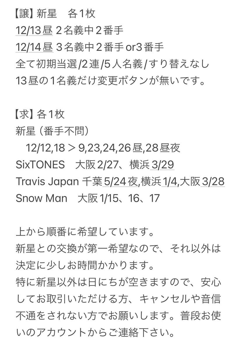 ジュニア Showcase 新星 交換を探しています 【譲】全て初期当選/2連/5人名義/すり替えなし 12/13昼 2名義中2番手 12/14昼 3名義中2番手or3番手 【求】 新星(優先) SixTONES 大阪 横浜 Travis Japan 千葉 横浜 大阪 Snow Man 大阪 安心してお取引させていただける方でお願いします。 #新星交換 pic.x.com/r3DO9s2YD8