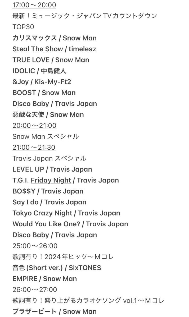 NEWSが1番上に来る時代。。。 以前は、 嵐もTOKIOもV6も、KinKi Kidsもいた。 こう見ると全体的にも、 ジャニーズって減ったなぁって思うし、 出演グループの中で、 デビュー時からメンバー変わらないのは、 SixTONES、Snow Man なにわ男子、Travis Japanのみ。 あと、カウコン出ないけどWEST.ぐらい。 pic.x.com/G8hwohnHUz