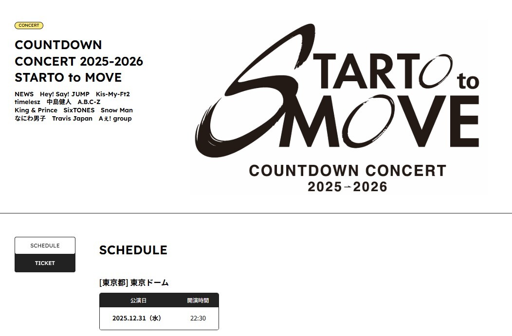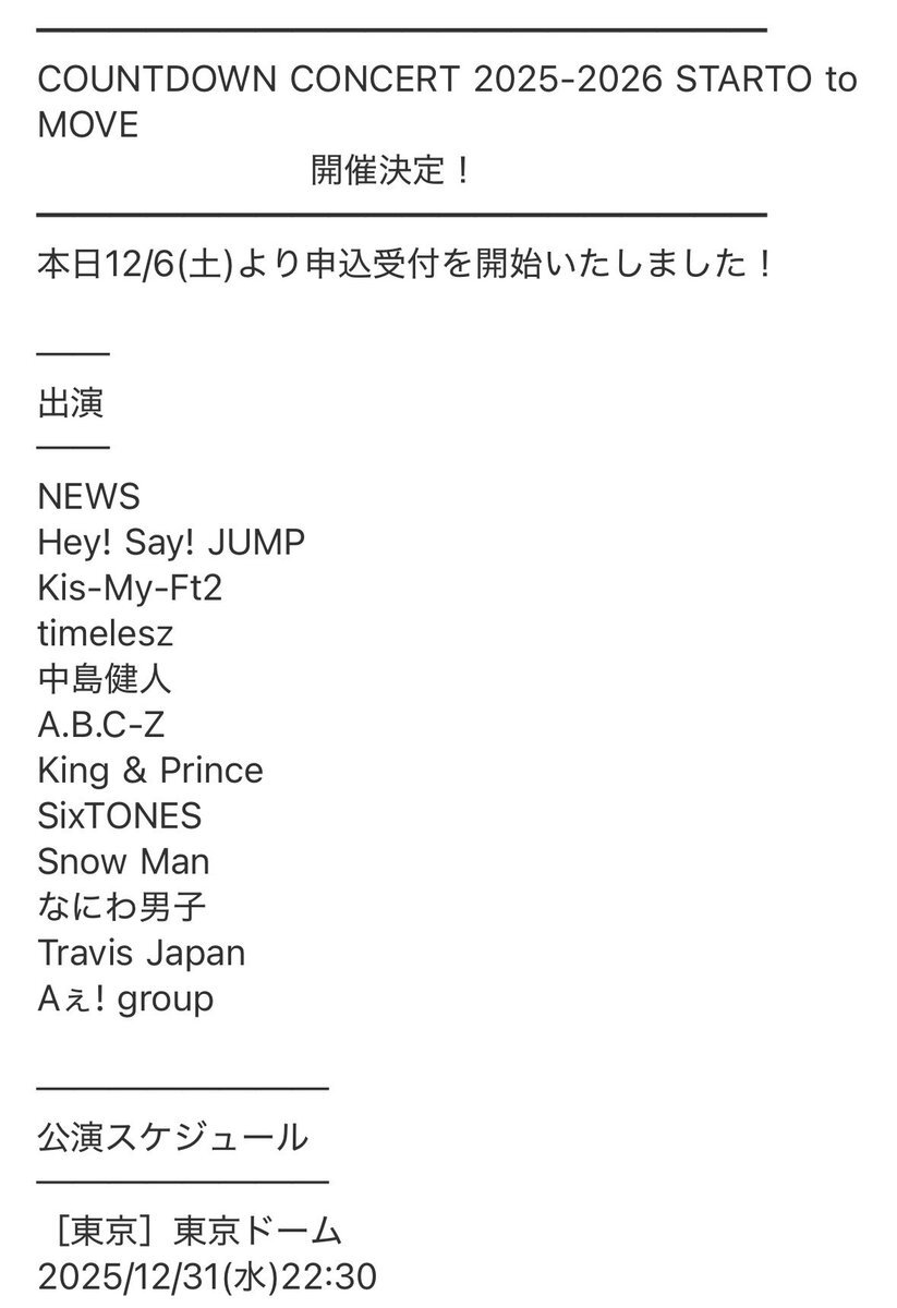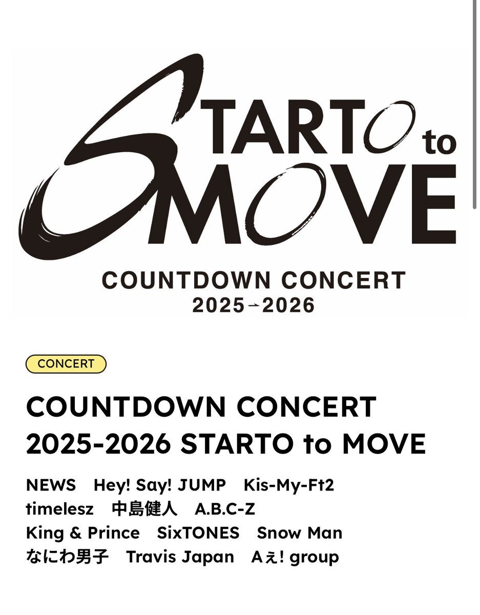 COUNTDOWN CONCERT 2025-2026 STARTO to MOVE”開催決定! 会場 東京ドーム 私は、聖地代々木に行きます。NEWS Hey! Say! JUMP Kis-My-Ft2 timelesz 中島健人 A.B.C-Z King & Prince SixTONES Snow Man なにわ男子 Travis Japan pic.x.com/Wy9JwQUYPN