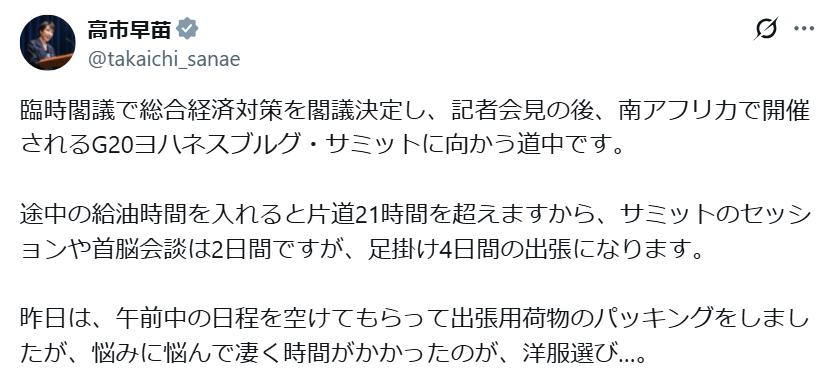 返信先:@Myoritomo1192遅松様皆様どうも🤚しかも晩餐会もばっくれたようですね〝YOUは何しに「南ア」へ?〟高市自身の↓この投稿びっくり!服装でマウントとるとかいい歳こいて稚拙なガキですね😔へずまレベルの知能指数が首相やってたら国がダメになる… オラオラは 特攻服で サミットへ #高市やめろ #あいうえお時事川柳 x.com/takaichi_sanae…