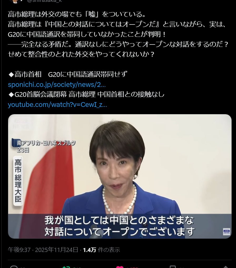 「冷静に」とか「ここは頭を冷やして」とか体を張って諫言する人が、高市首相の周囲にはいないんだろうね。イエスマンを揃えてしまったということだが、危険だよね。本邦初の女性首相を支える立場がイエスマンばかりでは。耳の痛い、嫌なことも言うのが最も大事な仕事だということを理解してないんだ。