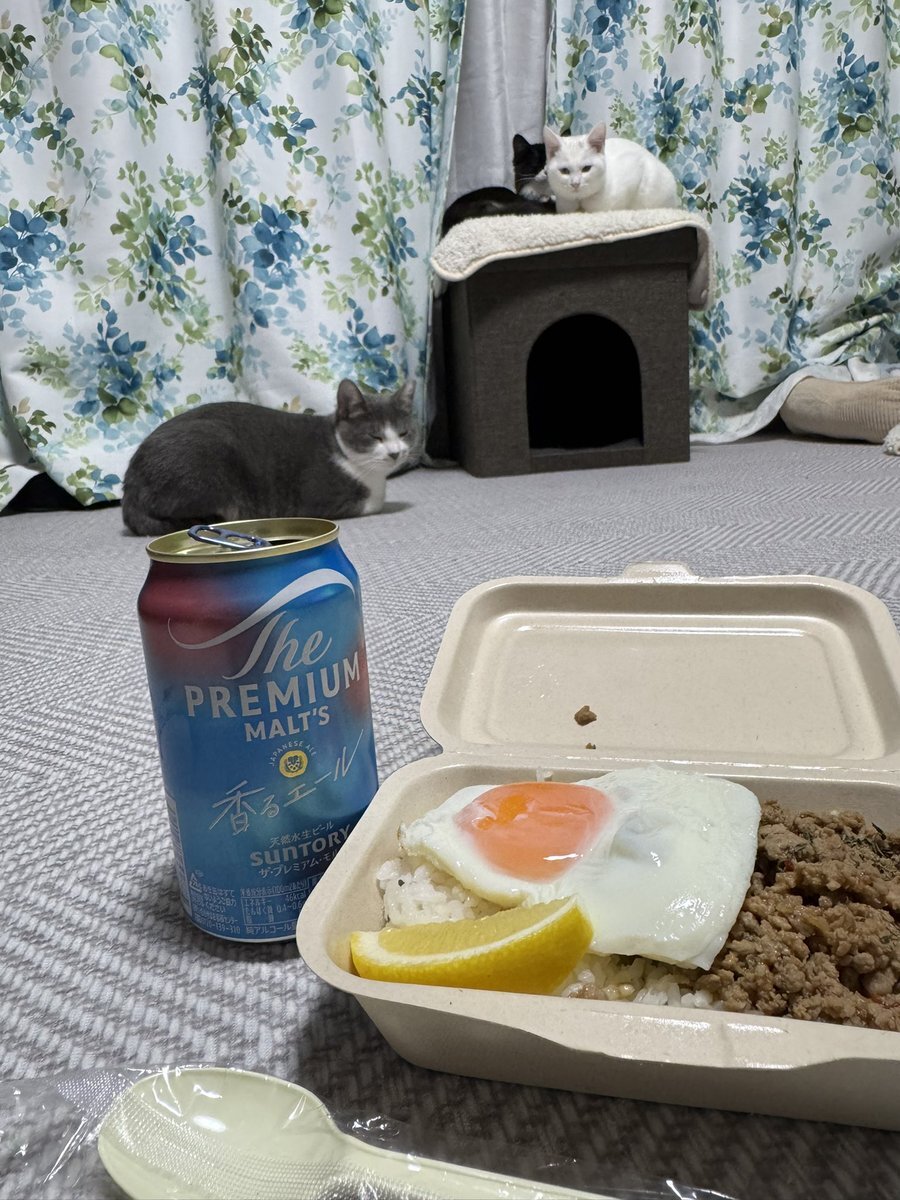 今宵のメシくれネッコ🍚🐈⸒⸒⸒⸒ フォーメーションバッチリ。盗み食い発生🤣 ニンゲンは推してるチームが逆転勝ちしたのでスタグルと香るエールで祝杯です🍻 #だいず🫛 #あずき🫘 #子さば🐟 #その子 #はちしらきょうだい pic.x.com/Dv29wwFjCL