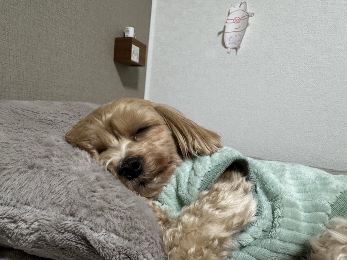 起きたら隣でおっさんが寝てました....🐶笑 #いぬ #マルプー #あずき pic.x.com/DHpDCfpnrV