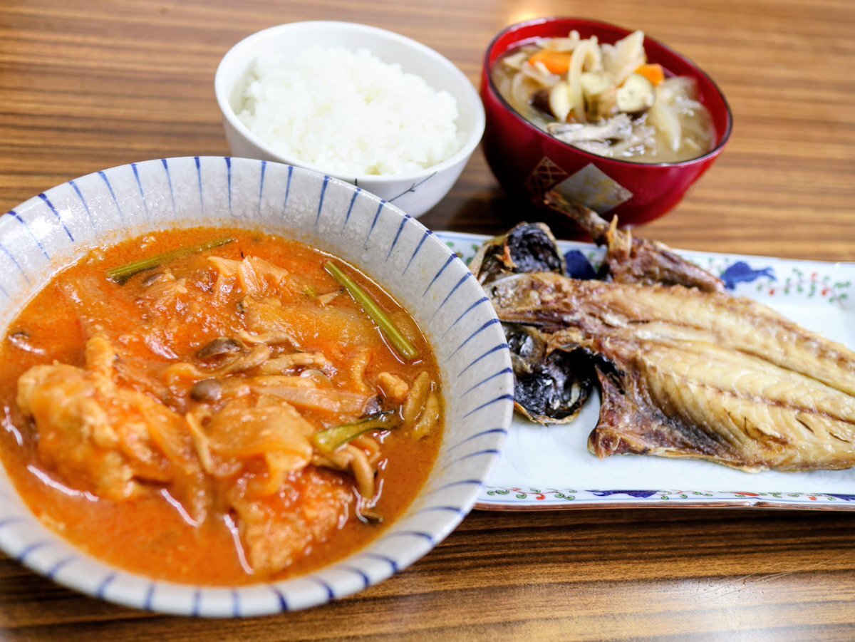 賄いお昼ごはんは… *鶏肉と野菜のトマトクリーム煮 *アジ干物 #あだたらの宿扇や #扇やの日常 #扇やの賄い pic.x.com/zR2nuIhby2
