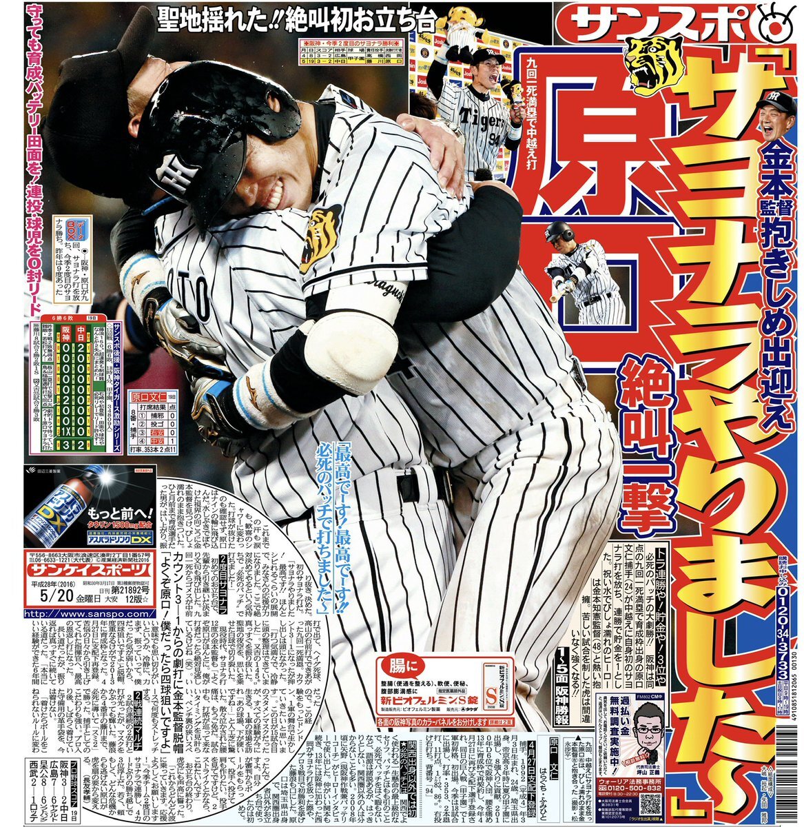 #大阪サンスポ #アーカイブ企画#あの日あの時」本日は2016年5月20日付1面、#阪神 #原口 選手の劇打です。サヨナラ打を放つと、金本監督が抱きしめて出迎えました。初のお立ち台では「やりましたーっ」と絶叫。甲子園は大興奮でした。 #おうち時間 のおともは #サンスポ o-sankei-hanbai.com/sankei/entry/f… pic.x.com/cYpNwKx4lk