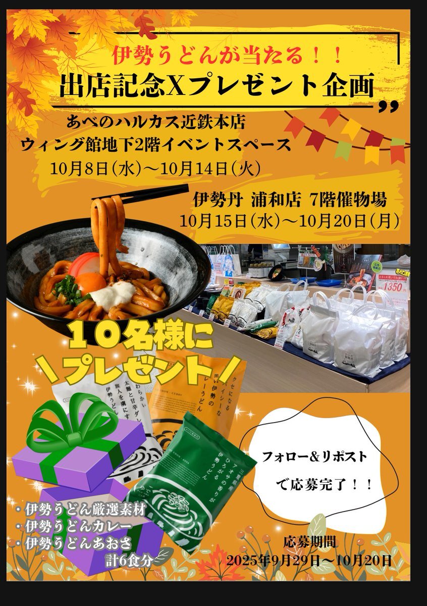 返信先:@kaida_iseudon#かいだ製麺所 #あべのハルカス #伊勢丹浦和店 出店記念プレゼントキャンペーン✨ グルメの秋🍁見つけにお買い物行きます🚶 伊勢うどん食べてみたいです😊 プレゼント🎁当選しますように🙏