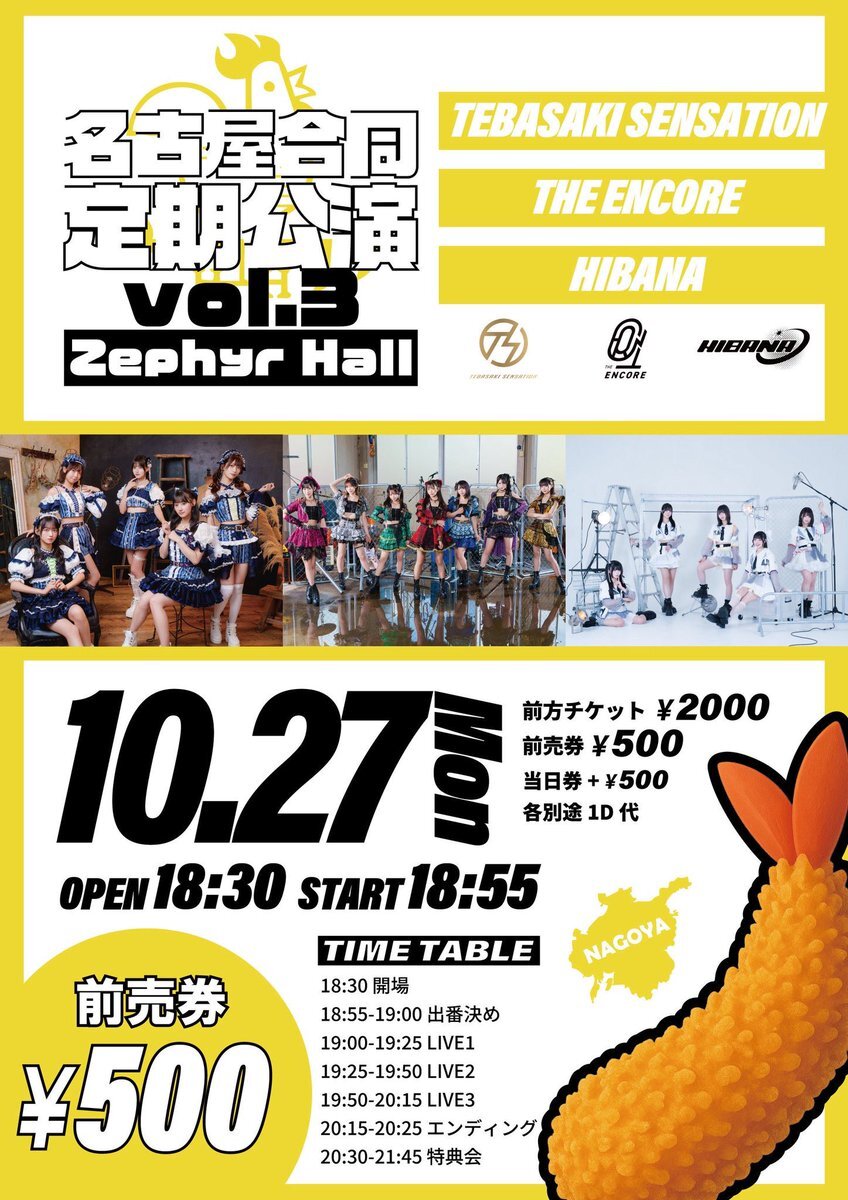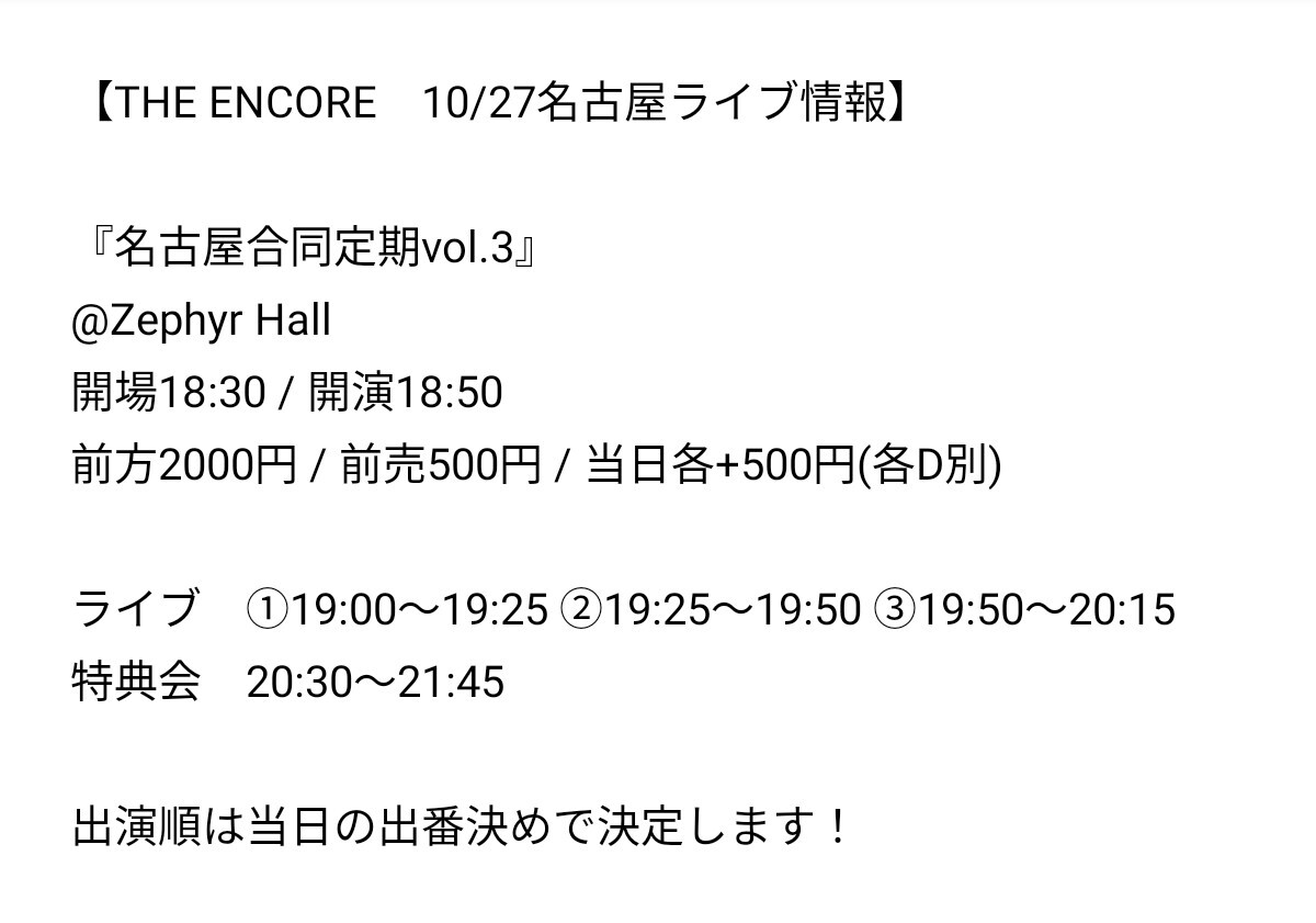 【THE ENCORE応援ポスト】 ☆対バンライブ情報10/27 『名古屋合同定期vol.3』 @Zephyr Hall 購入:t-dv.com/nagoyagodo_vol3 ※10/26 23:59まで販売 出演順はどうなるのか楽しみです! 今回も合同定期公演盛り上がって行きましょう! #アンコール #あんこ pic.x.com/4mhXkuNc58