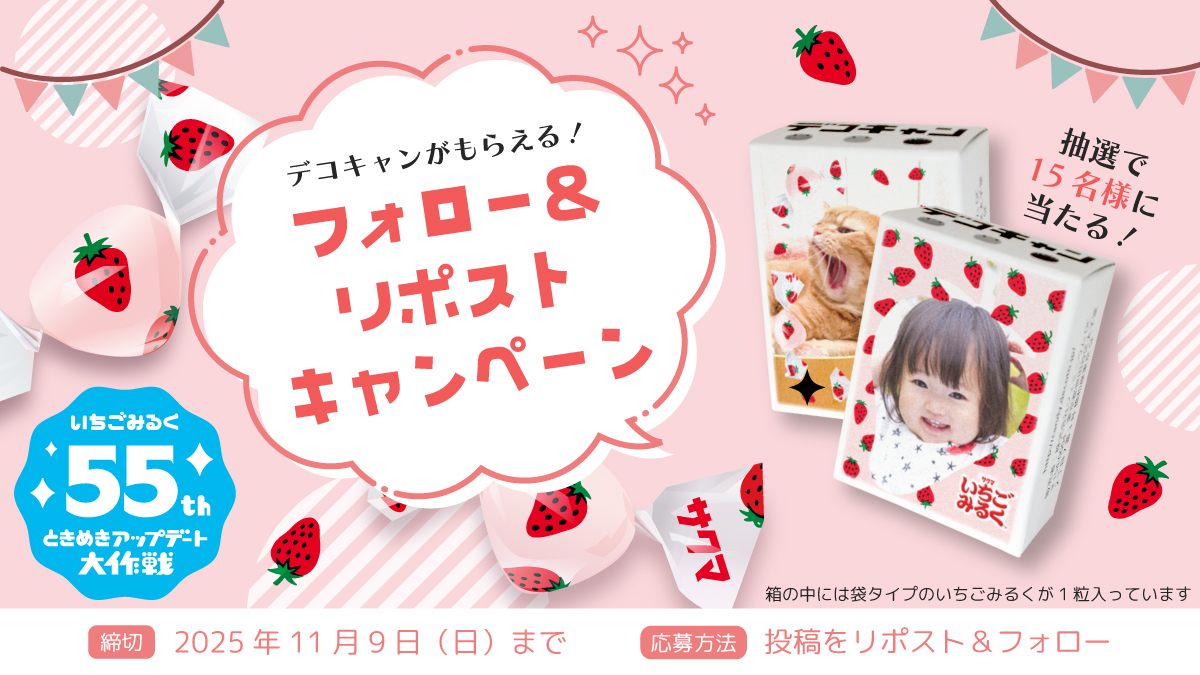 #いちごみるく 55周年記念🍓🍬 フォロー&リポストキャンペーン いちごみるくが1粒入ったオリジナルボックスが作れる #デコキャン 1セットを15名様にプレゼント🎁✨ ① @decotojp をフォロー ② この投稿をリポスト (引用でいちごみるくの思い出を書くと当選率UP!) ③ 当選者にはDMでお知らせ📩