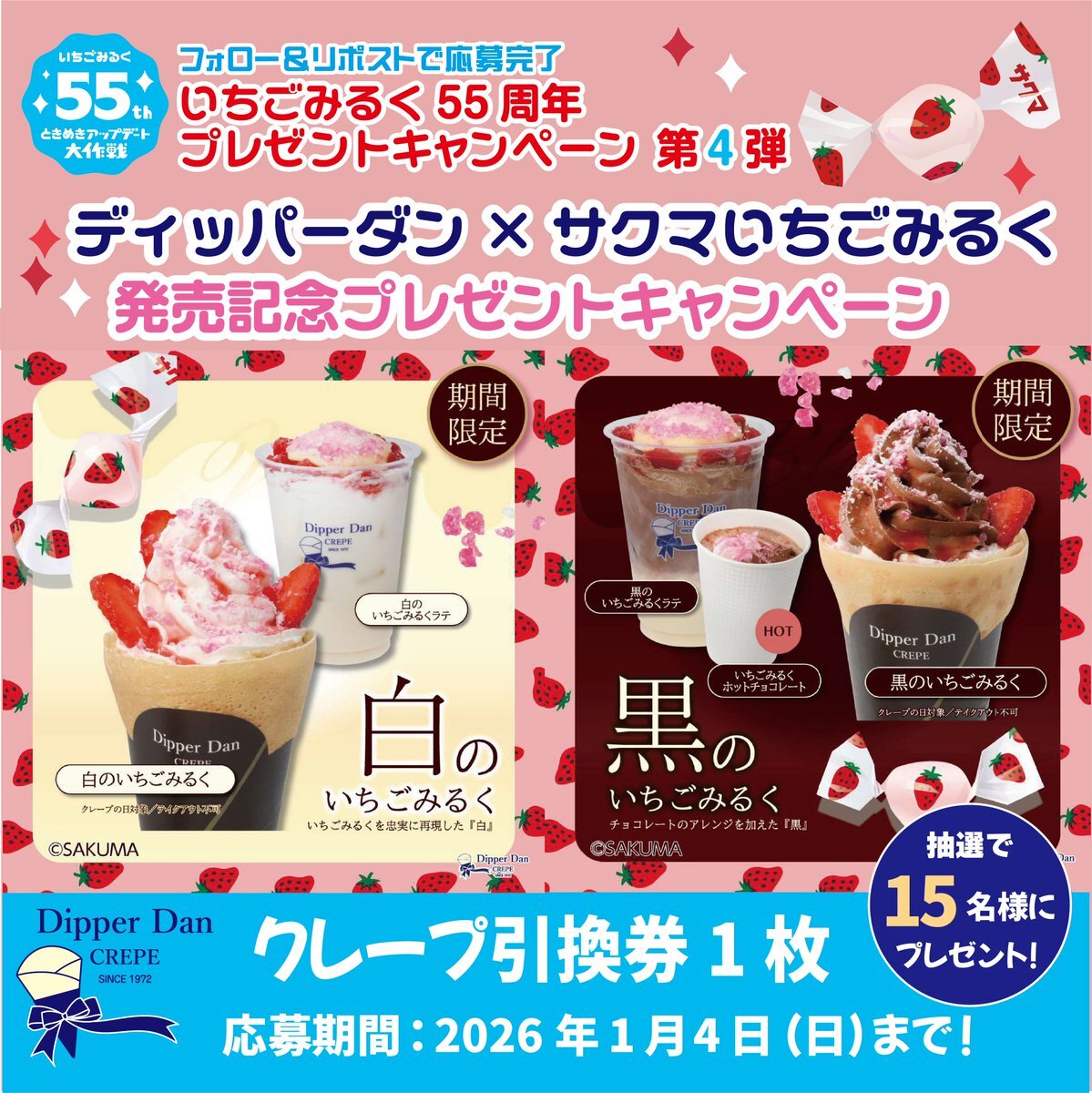 / いちごみるく55周年記念🍓🍼 #プレゼントキャンペーン 第4弾🎁 \ #ディッパーダン と #いちごみるく のコラボクレープ発売を記念して クレープ引換券を抽選で15名様にプレゼント🍬🩷 ❐@sakuma_seikaをフォロー🍓 ❐この投稿をリポスト🔁 ❐当選者にDMでご連絡💌 〆切:1/4 #プレゼント企画