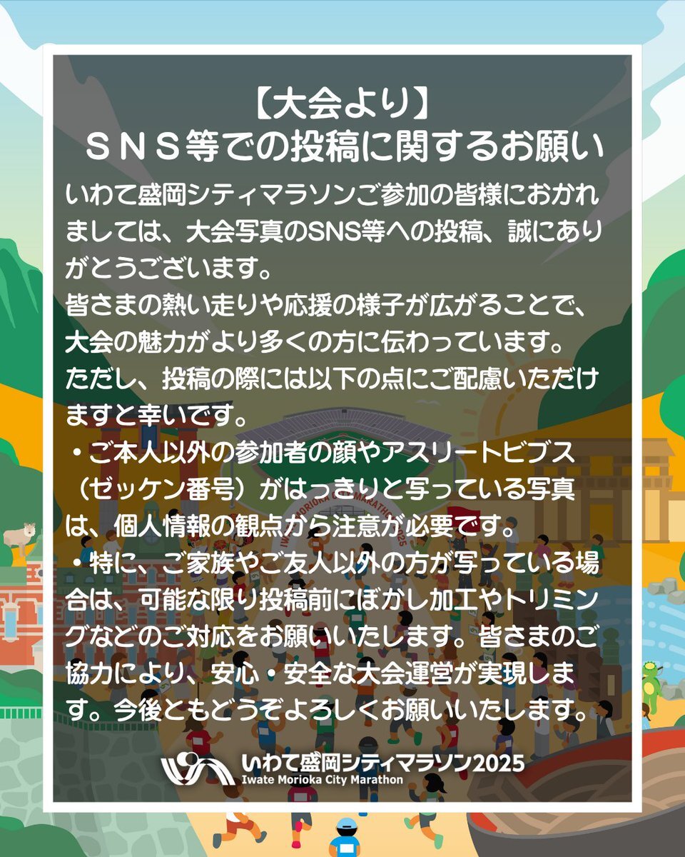 #いわて盛岡シティマラソン 大会写真のSNS等への投稿、誠にありがとうございます。 皆さまのおかげで、大会の魅力がより多くの方に伝わっています。 なお、投稿の際には注意事項にご配慮いただけますと幸いです。皆さまのご協力により、安心安全な大会運営が実現します。よろしくお願いいたします。