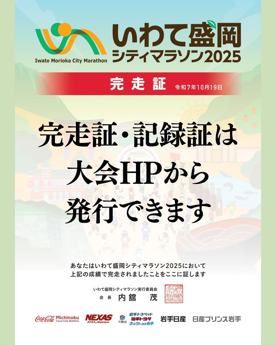 いわて盛岡シティマラソン2025に出場された皆様の大会記録は下記URLから確認することができます。 お名前やアスリートビブス番号で検索すると記録証をデータで発行することも! ご自身の努力の証、ぜひご覧ください! runnet.jp/record/race.do… #いわて盛岡シティマラソン pic.x.com/cLk5P9LAM8