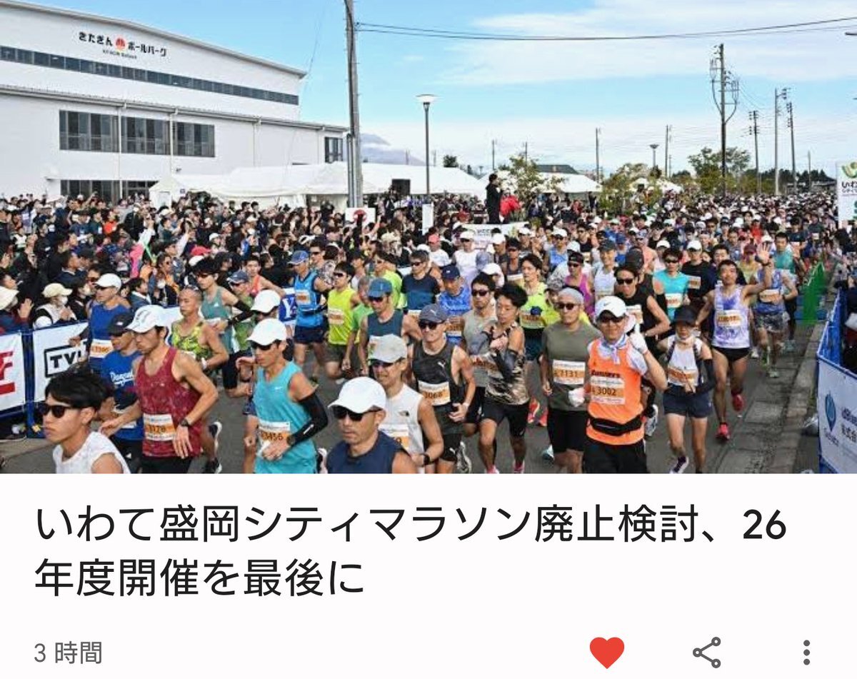 参加したことある大会が無くなるの寂しい。東北は復興マラソンもそうだけど色々厳しいな。#いわて盛岡シティマラソン x.com/iwatenippo/sta…