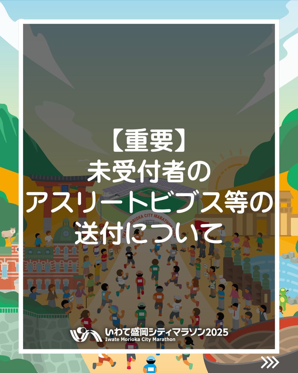 前日受付を実施しなかったエントリー者のアスリートビブス等受付セット(オプションのTシャツ等を含む)について、RUNNETでご登録の住所に、大会終了後1カ月をめどに着払いでお送りいたします。 大会エントリーの記念に、ぜひお受け取りください。 #いわて盛岡シティマラソン pic.x.com/gOqpbNFzq1