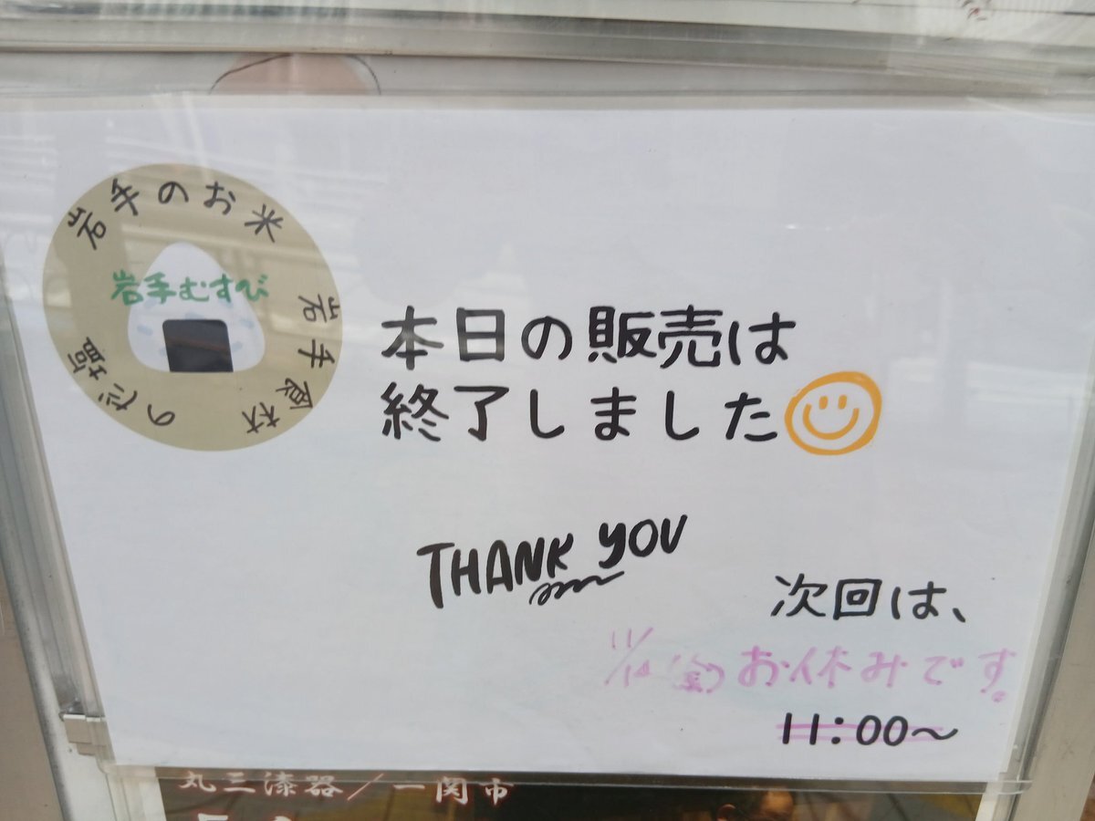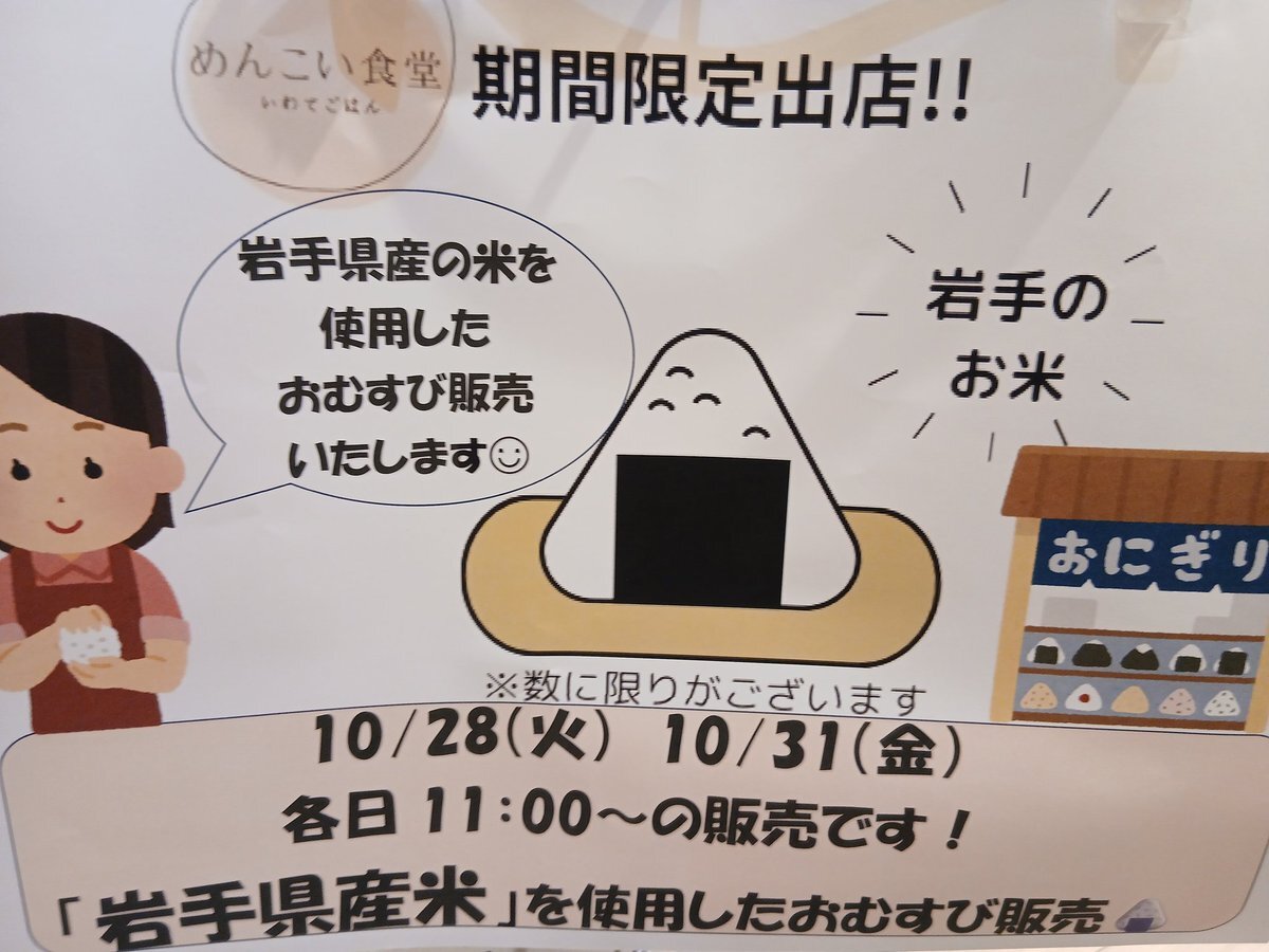 🍙めんこい食堂🍙 🍙🍙岩手むすび販売会🍙🍙 本日の販売は終了しました。 次回11/14は都合によりお休みです。 #いわて銀河プラザ #めんこい食堂 #岩手むすび #おむすび pic.x.com/gma35fQg2Q x.com/IwateGingaPlaz…