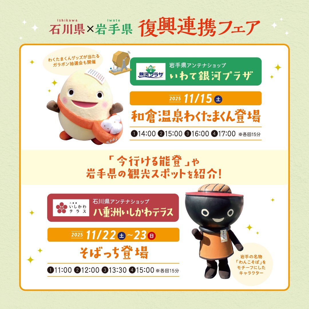 📣おでかけ予定 『石川県×岩手県 復興連携フェア』 岩手県のアンテナショップにおでかけするよ〜(*´∇`*) ★日時 2025年11月15日(土) ★会場 いわて銀河プラザ ★おでかけ時間(予定) ①14:00〜 ②15:00〜 ③16:00〜 ④17:00〜 #和倉温泉 #わくたまくん