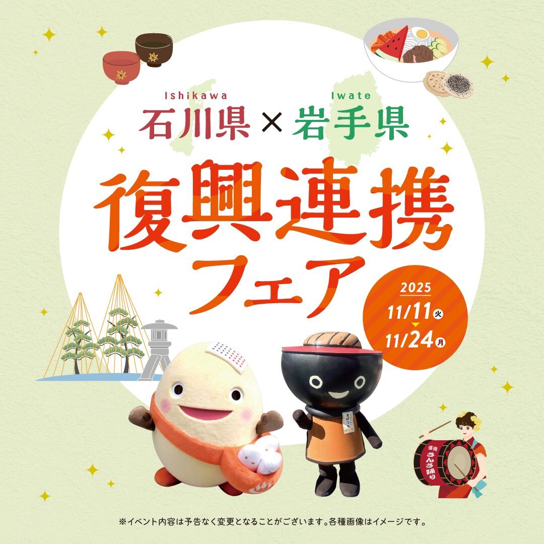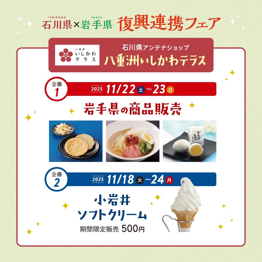 【石川県×岩手県 復興連携フェア】 両県のアンテナショップで、県産品販売やご当地ソフト🍦 ゆるキャラ登場など楽しい企画をご用意しております✨ 詳細は画像をチェック! ※各種イベントの日程が異なりますのでご注意ください。 #八重洲いしかわテラス #いわて銀河プラザ #石川県 #岩手県 pic.x.com/bfEpOonJ2k