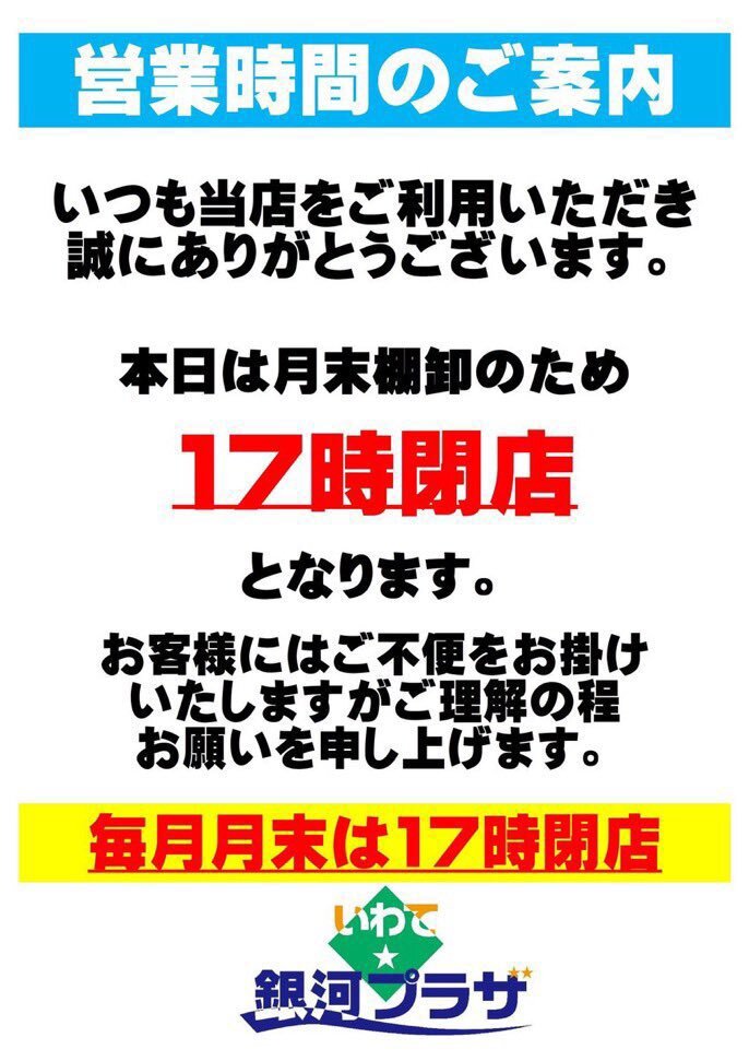 いわて銀河プラザを いつもご利用いただきありがとうございます✨ ご不便をお掛けして恐縮ですが、本日は棚卸のため、17時までの営業となります🙇‍♂️ 商品のお取り置きご予約済みのお客様は、ご留意頂きますようお願いいたします💡 #いわて銀河プラザ #岩手県 #アンテナショップ pic.x.com/yMhkaYxqV1