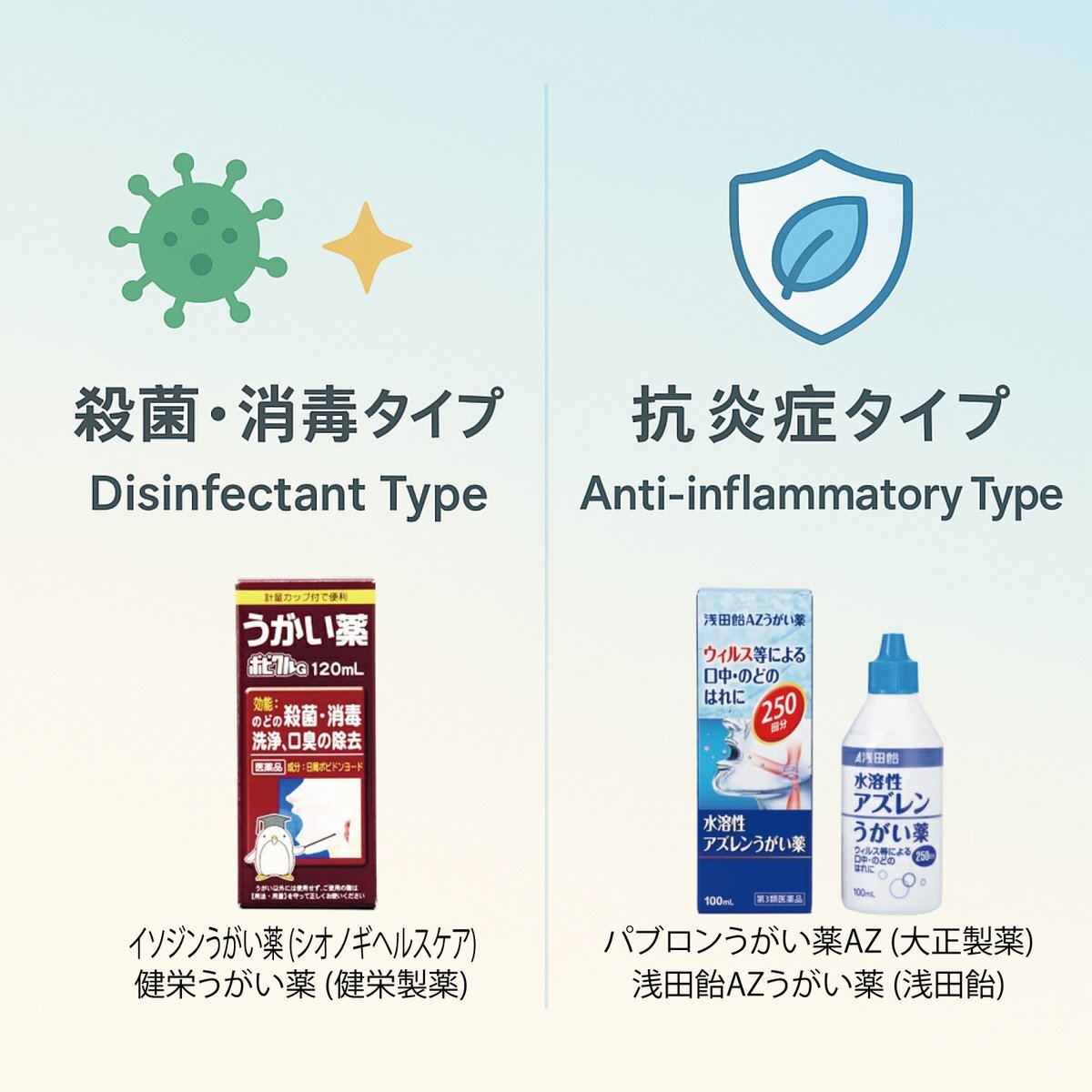 うがい薬の選び方、主要成分で分類! 1.殺菌・消毒系: ポビドンヨード、CPCなど。風邪予防や口臭ケアに。 2.抗炎症系: アズレン、GK2など。のどの腫れ・痛みに効果的。 目的に合わせて使い分けよう! #うがい薬 #成分分類 #風邪対策 pic.x.com/yJoyHwb1yL