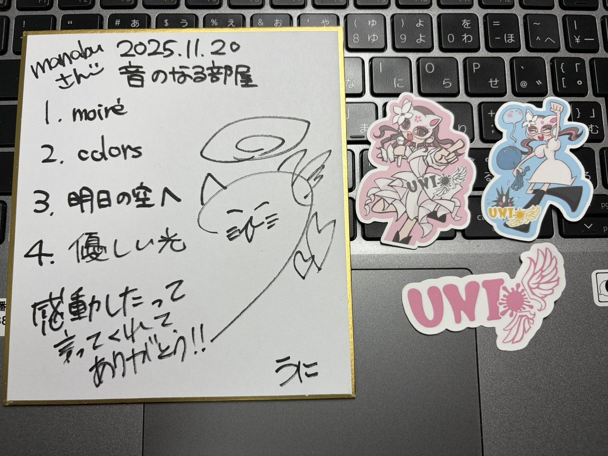 2025/11/20 #大井町E-LOUNGE #音のなる部屋 vol.30 #うに@uni_oicyo) 今回はオケ音源無しで、キーボードのWiSさん(@WiSteria4100)とのコラボ🎹 流れるような旋律に乗せて、うにさんの綺麗で力強い歌声が響き、感動のライブでした✨🥹 🎵優しい光 pic.x.com/cLBQt6MlvI