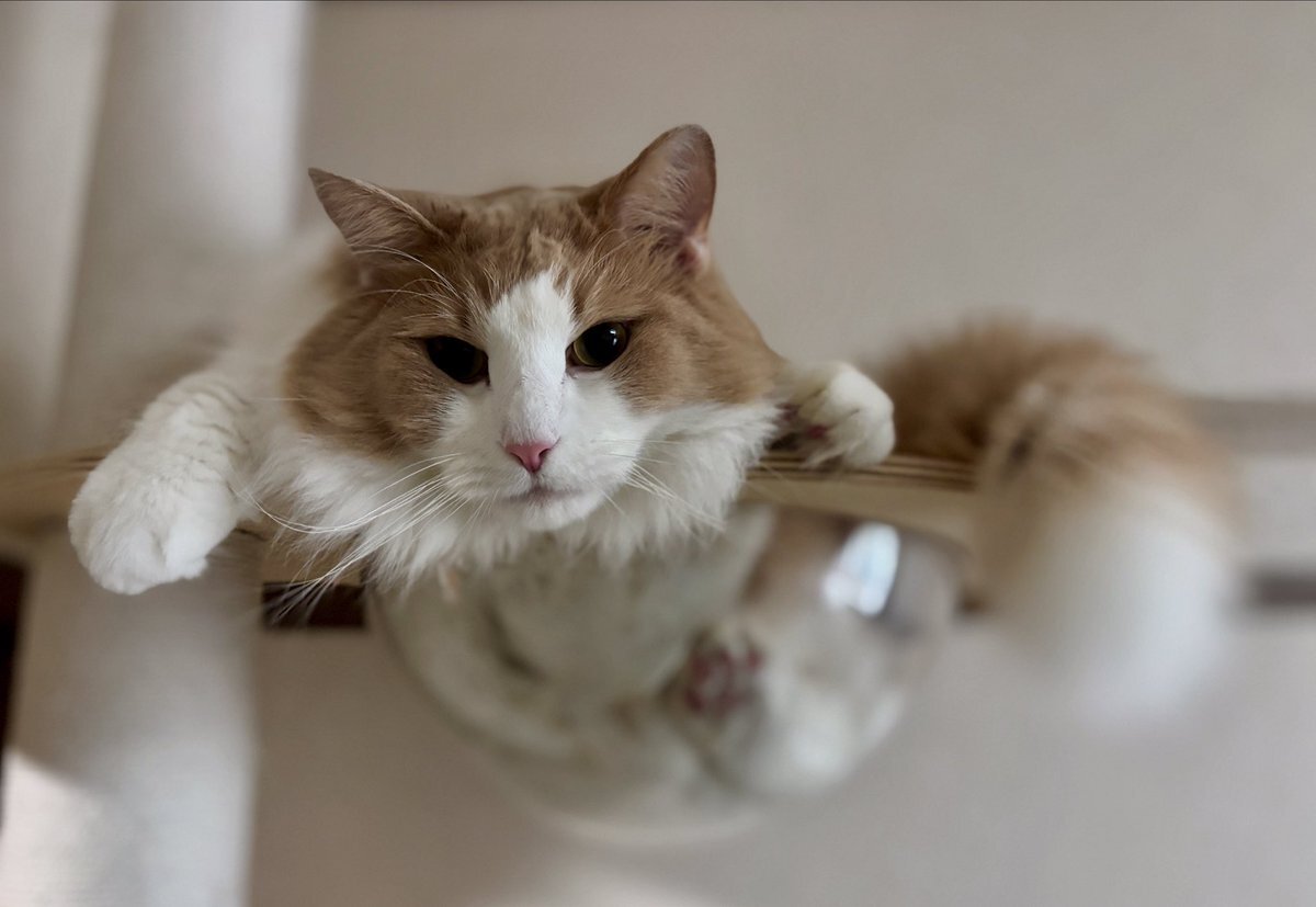 キャットタワー頂上の透明ボウルでご満悦のうにさん #ノルウェージャンフォレストキャット #うに🐈 pic.x.com/to2zb0I441