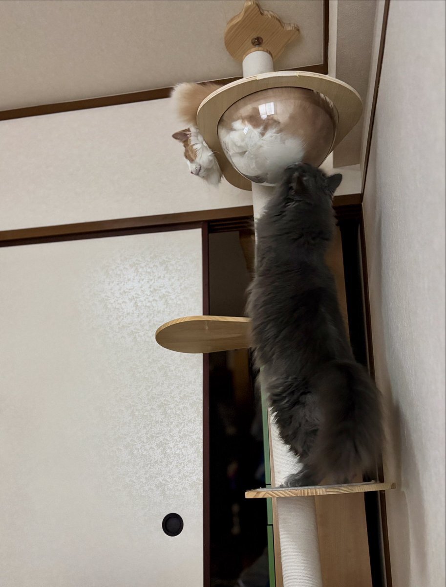 うにが久しぶりにキャットタワーの1番上の透明ボウルに。 ネズミさんのオモチャを入れておいたら気づきました🐁 すみも気になってお尻を覗いています。 最近はすみがよく登っていました。うにが椅子で寝ているので… #ノルウェージャンフォレストキャット #うに🐈 #スコティッシュフォールド #すみ🐈‍⬛ pic.x.com/BLWssohNB6