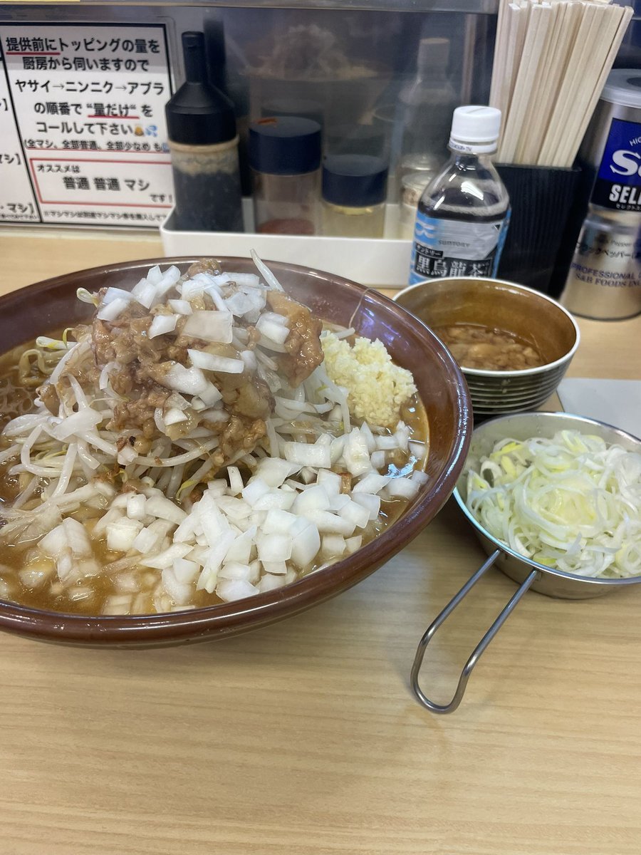 春日部 顎で喰らえ ラーメン450 マシ マシ マシマシ タマネギ長葱 豚抜 久々にパパとランチ🍜 ガッツリ食べたら、汗だくでダイエットなり🤣 美味いし、ダイエットになるし最高だったなぁ🤭 #ラーメン #最高 #うますぎ #アブラサラダ pic.x.com/NlSBlUHR1Y