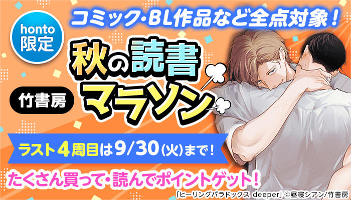 【honto限定】 竹書房 秋の読書マラソン💨 4周目は9/30(火)まで! 『ヒーリングパラドックス deeper』 #昼寝シアン 先生 などコミック・BL作品も全点対象👏  たくさん買って・読んでポイントゲット! ⇒honto.jp/cp/ebook/2025/…
